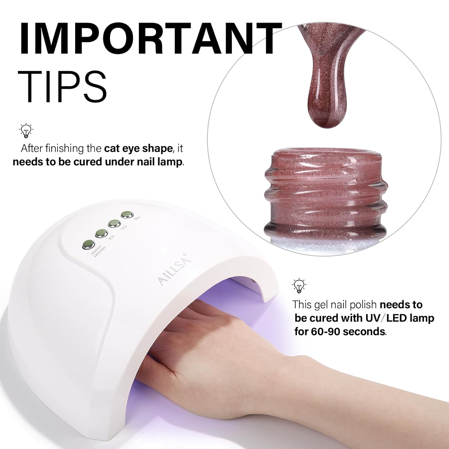 - CRYSTAL SPARKLING EFFECT - AILLSA Cat Eye Gel Nail Polish has a dense magnetic powder that can be used alone for a mirror-shimmering, crystal-clear manicure or with any base color nail polish, jelly gel nail polish, and other nail polishes.