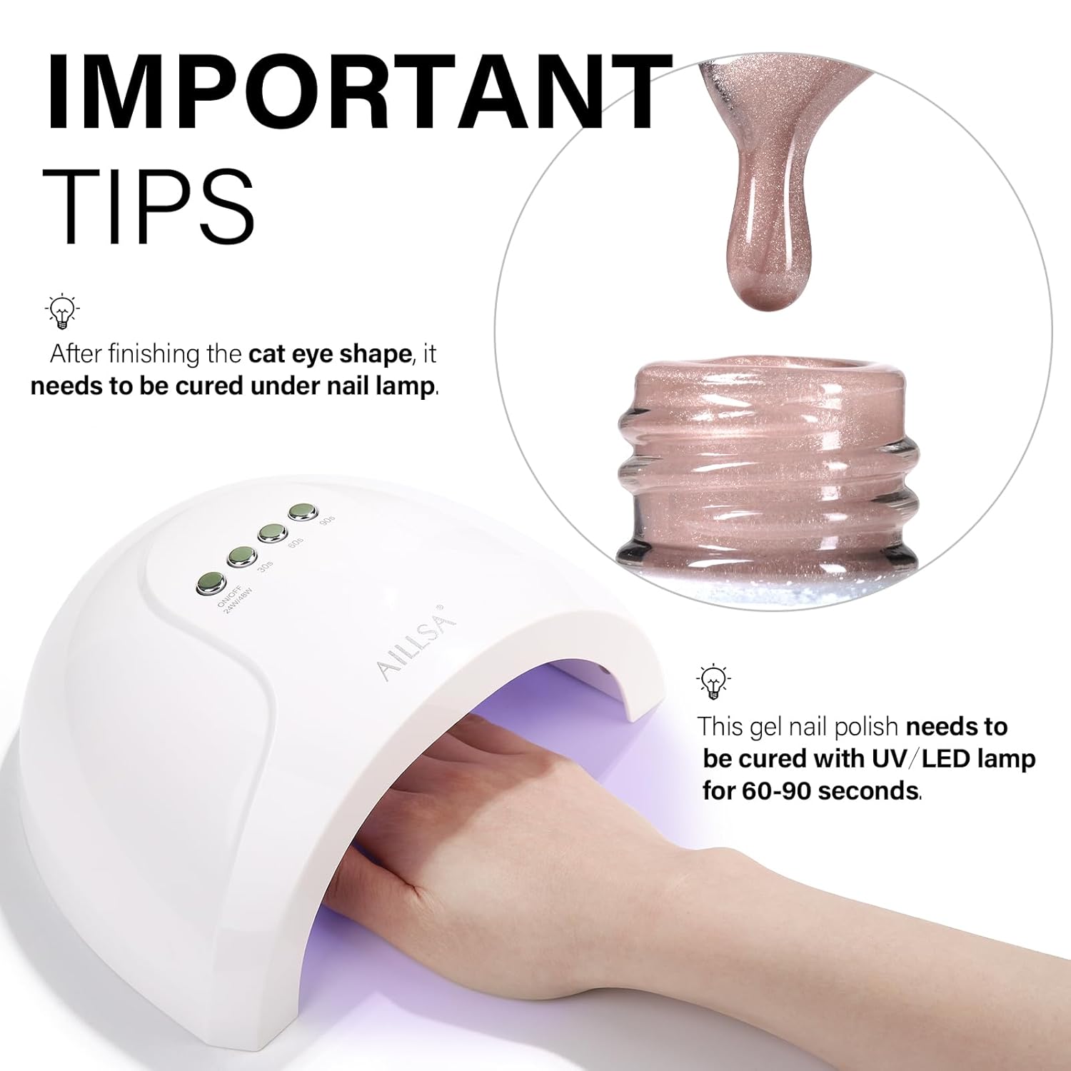 - LONG LASTING SHINE - AILLSA magnetic nail polish needs to be cured under U V lamps, and with the right application procedure, it can last 21-28 days to maintain the glittery shine. You no longer have to worry about your nails peeling off in the shower or while doing chores.