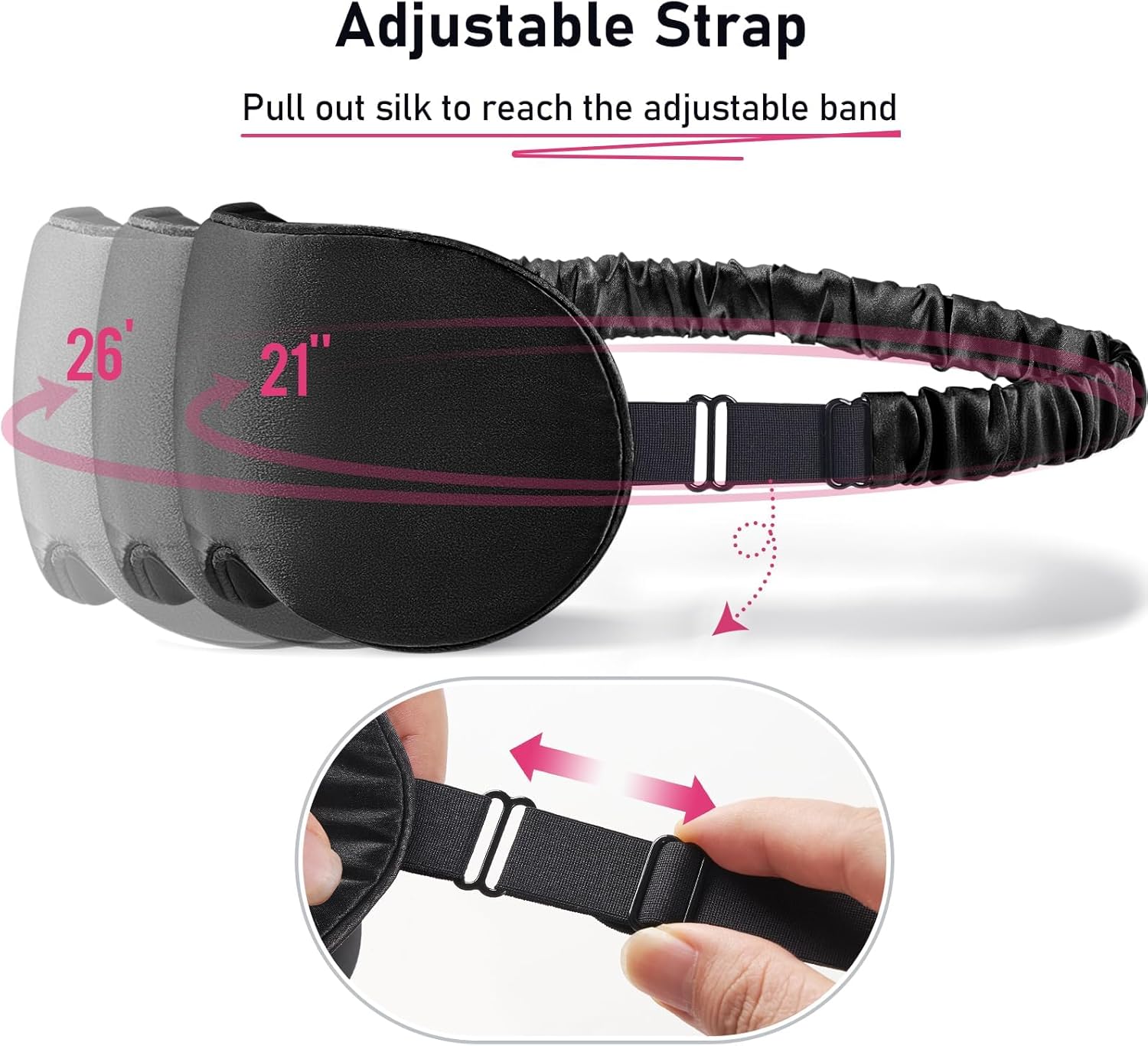 - Adjustable Strap: Our elastic buckle strap covered with 100% Mulberry silk on both sides, making it so comfy on your head, and doesn't tangle/stick your hair unlike other masks can be easily adjusted from 21 inches to 26 inches to fit all different head sizesโmen, women, and kids