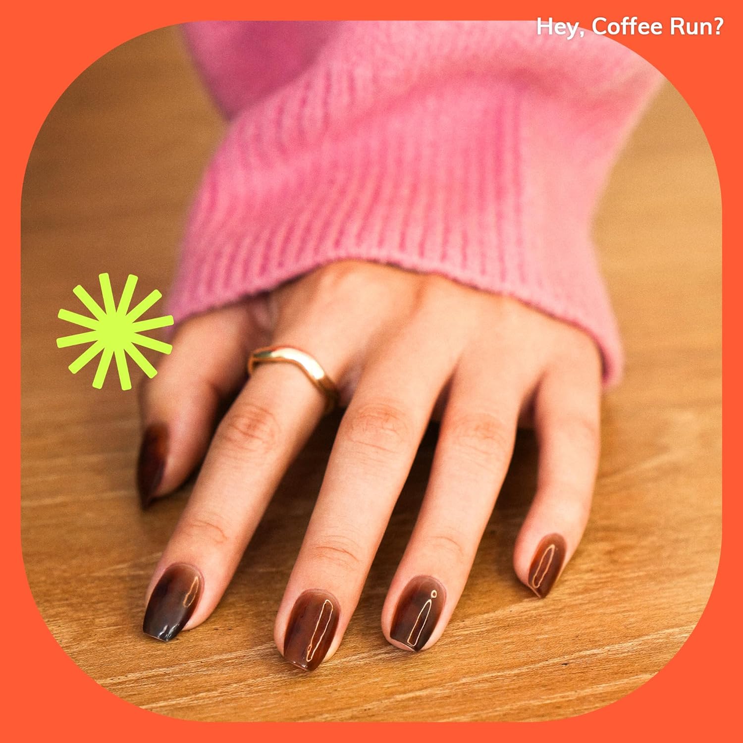 Semi Cured Gel Nail Strips | No LED Lamp Needed | Marble, Brown | Easy Apply & Remove, Salon Quality | Includes 28 Strips, 1 Prep Pads, Nail File & Wooden stick - Hey, Coffee Run?