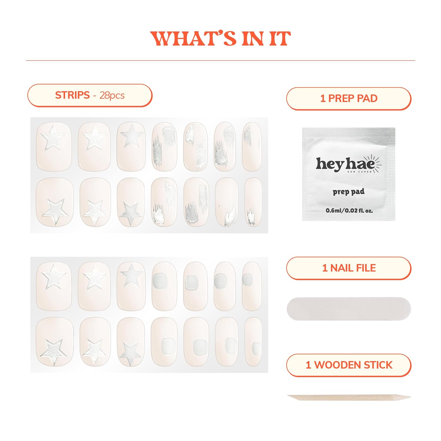 - Enjoy a complete package of fresh salon quality nails done at ease everywhere and anywhere you go! Package includes: 28 strips, 1 Prep pad, 1 Nail file, & 1 Wooden stick.