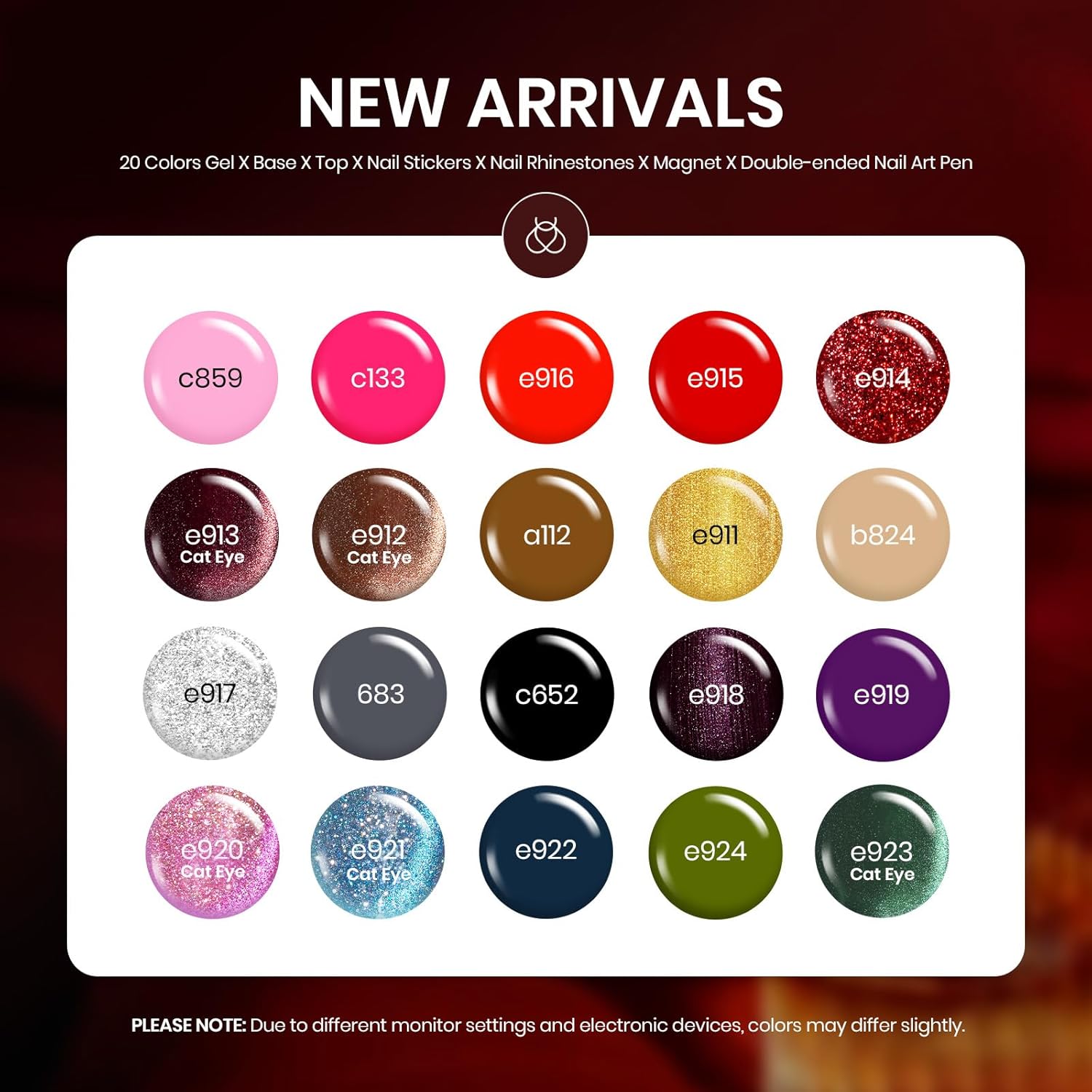 Beetles Fall Gel Polish Kit, Cat Eye Glitter 20 Colors Fall Brown Burgundy Gel Polish With Sticker Rhinestone Base Coat Glossy & Matte Top Coat Mob Wife Collection Winter Gifts for Women