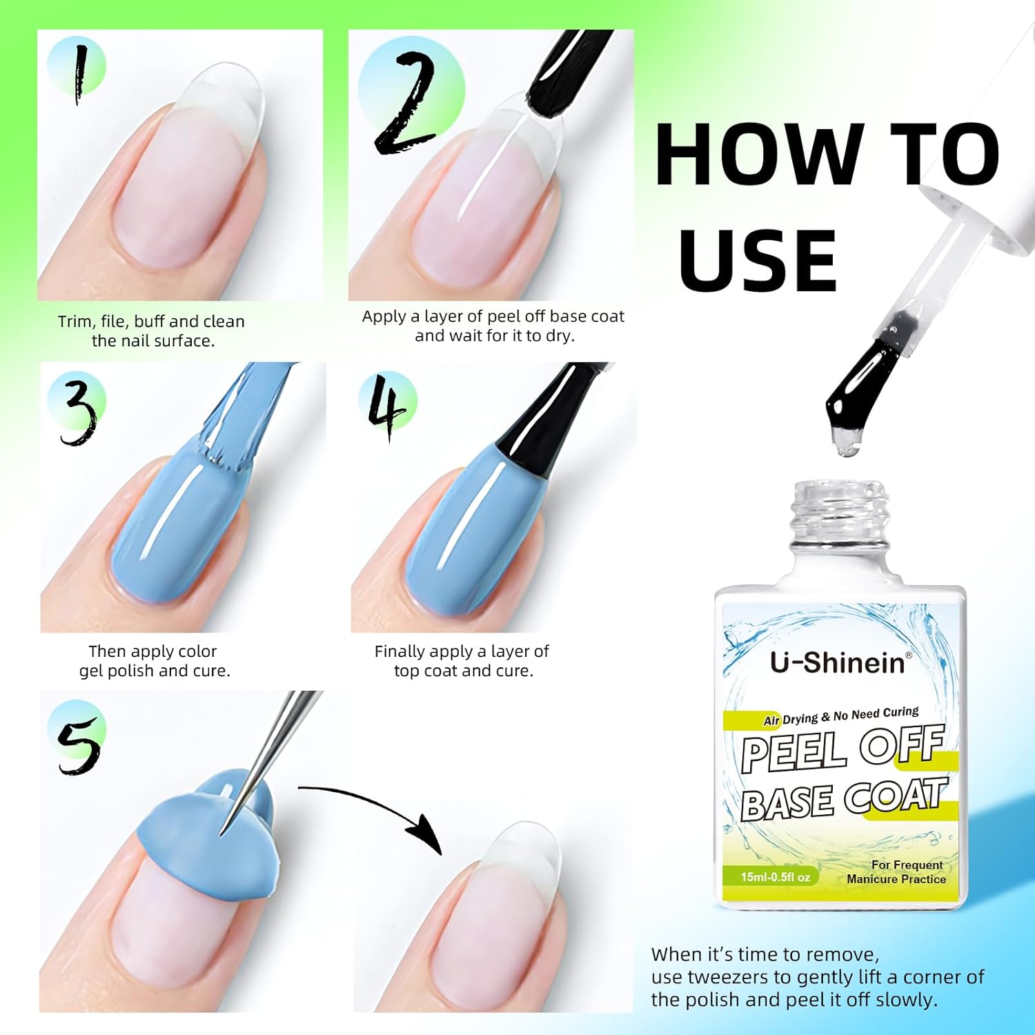 - EASY APPLICATION: Applying our Peel-off Base Gel is a breeze. After preparing and buffing your nails, simply apply a layer of the base coat and let it air-dry. Then, proceed with your desired nail art, curing each layer as needed. When it’s time to remove, use tweezers to gently lift a corner of the polish and peel it off slowly. For easier removal, soak your nails in warm water before peeling.