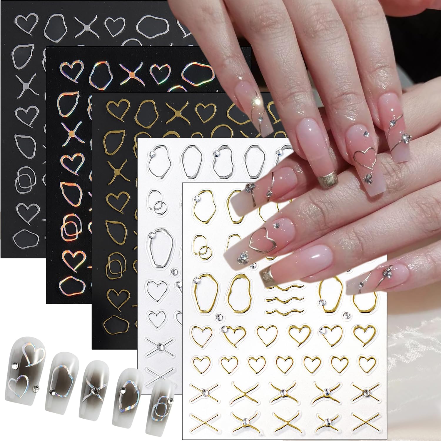 - âFashion French Stickers Set :You will get 5 sheets rhinestone lines theme lines nail stickers ,colorful lrregular line stripe nail design stickers decals are the perfect fashion accessories.Large number of different patterns for you to use and replace in daily life, heart nail decals are full of sensuality and elegance, Various charming patterns bring you a different mood.
