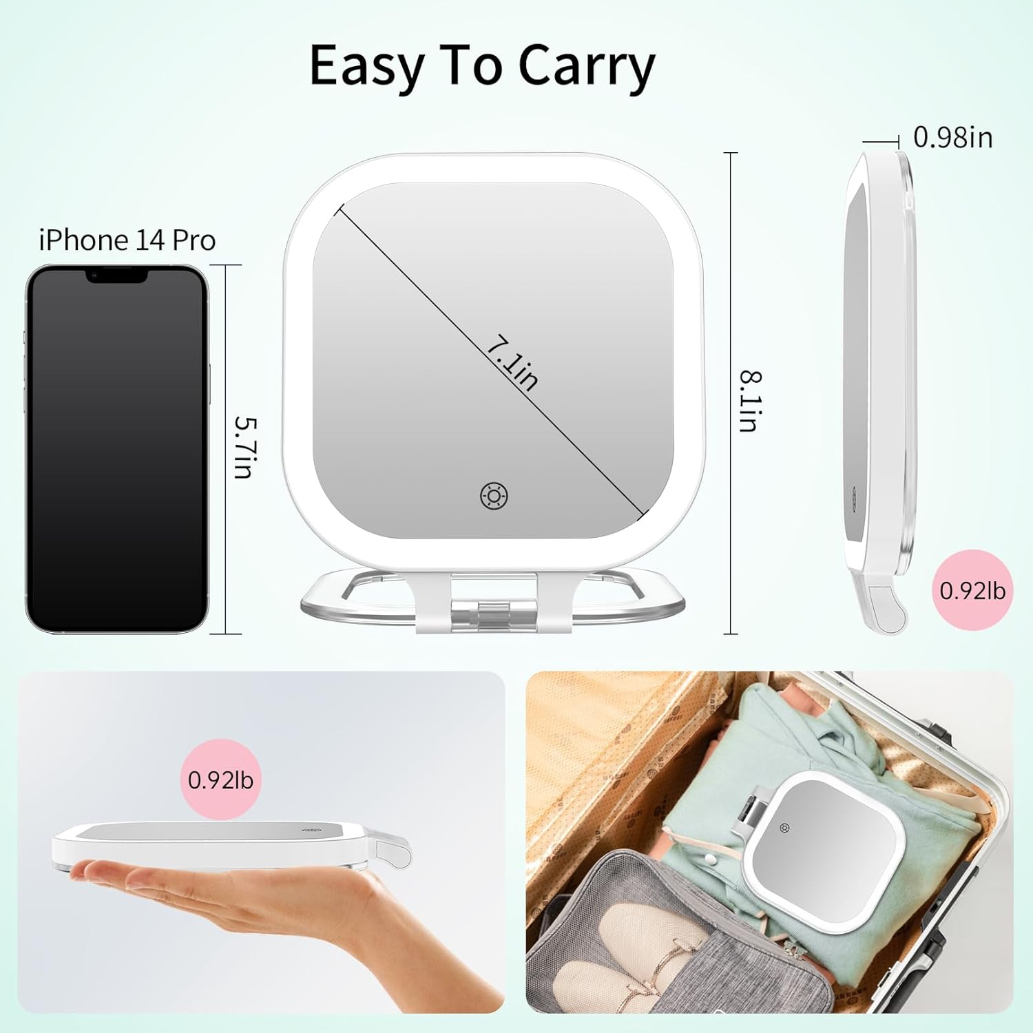 - 💝【FASCINATE 2025 Upgraded Travel Makeup Mirror】 In response to customer requests for a more travel-friendly magnifying makeup mirror, we have upgraded the 2000mAh rechargeable lithium battery. The travel mirror with light can be used for 6-10 days when fully charged. The travel mirror size is: 8.1 * 7.1 * 0.98 inch, weights only 0.9 lb, which is enough to meet your makeup and touch-up needs for daily commuting and 2-3 days of business or travel.