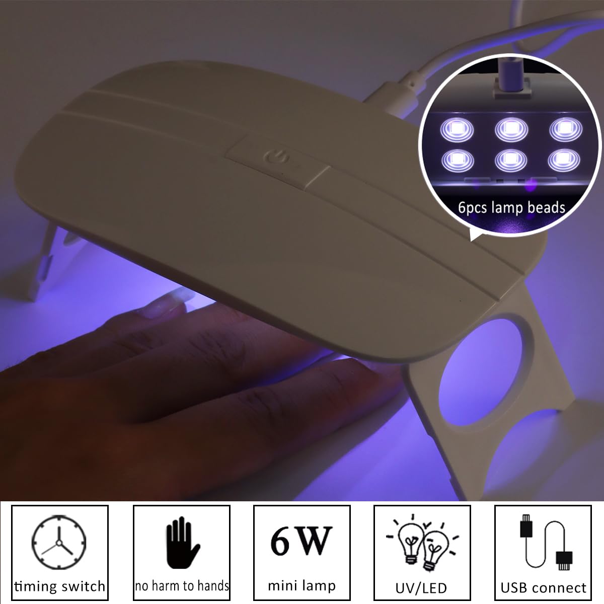 - ăMini Nail Lampă A portable USB interface mini nail lamp is included in the poly gel nail kit.The nail lamp is UV/LED light and have 6 lamp beads. Easy to cure nail poly extension gel,nail gel polish,base coat and top coat,nail art glue and so on.