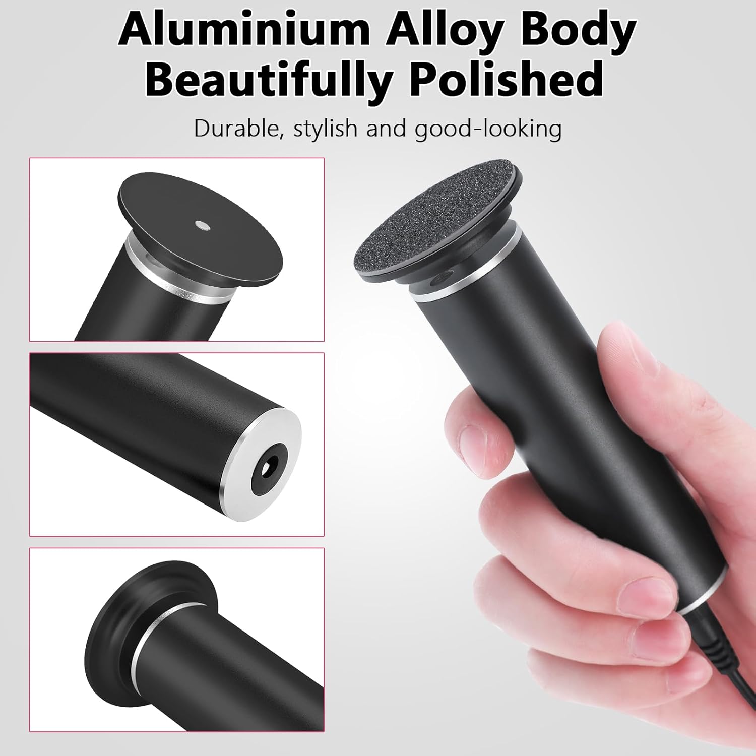 - SMOOTH AND QUIET OPERATION: Our electric foot file is made with an excellent motor that is quiet when using it. The body of the foot grinder is a smooth aluminum alloy shell that looks great, compact and light weight, comfortable to hold.