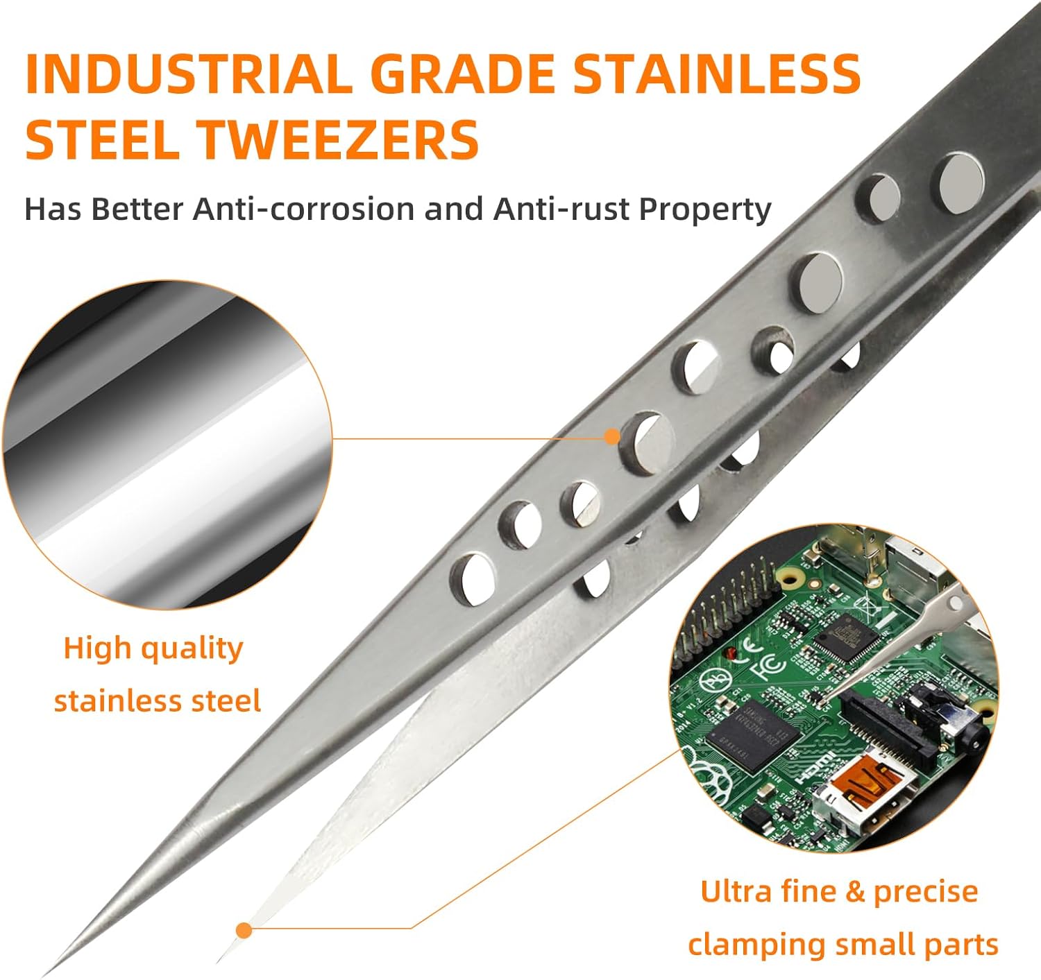 - โ Precision tweezer set made of high quality stainless steel, wear-resisting, rust protection, anti-corrosion; Frosted surface, nine-hole hollow design, anti-skid function. The teweezer tips are accurately aligned with anti-skid handle which can hold the tiny things precisely, making the effect better, give you a better feeling.