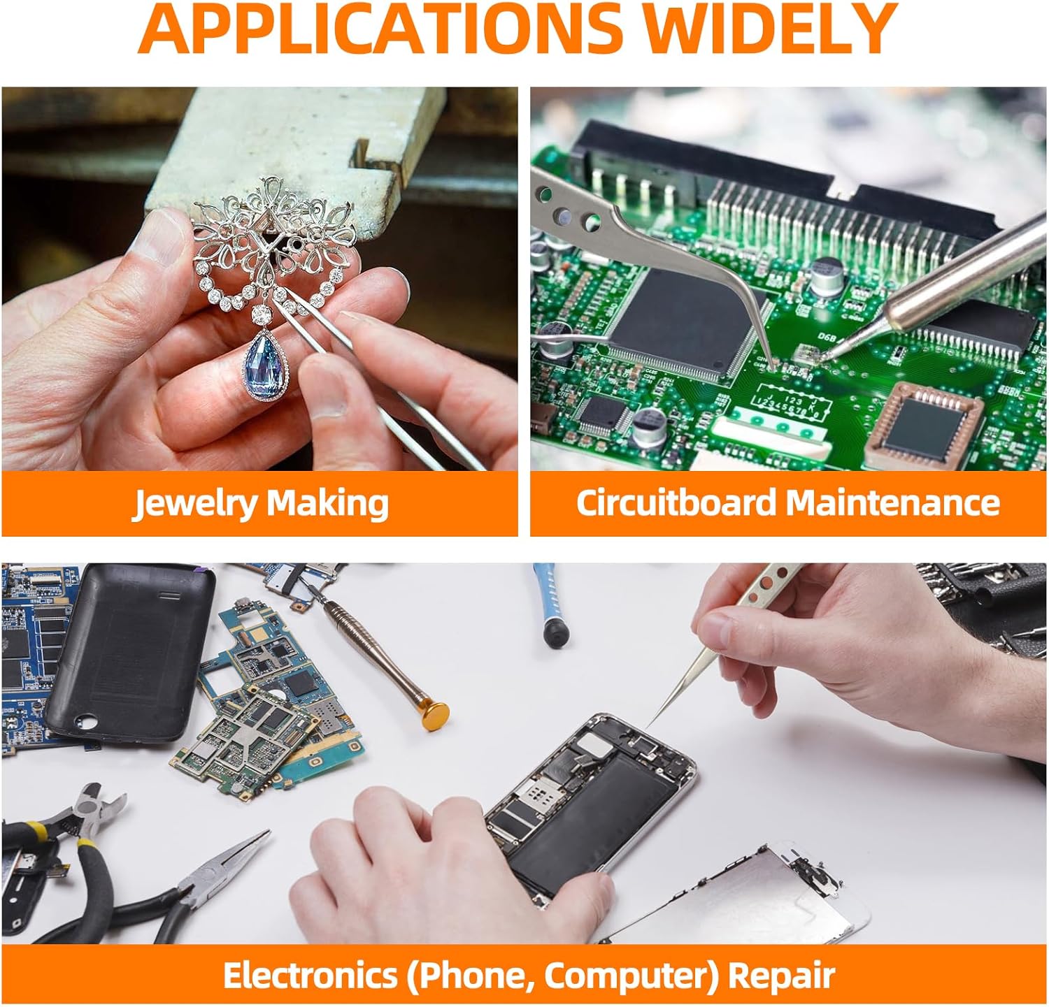 - โ FEITA multifunctional tweezers set has 5 types of tweezers, which suit for Electronics Repair, Craft, Jewelry, Soldering, Lab work, Model making, Stamp or coin collecting, Weeding vinyl design, Ingrown hair removal, Eyelash extension, Eyebrow removal, Paper Sculptures, Embroidery, Phone repair, Watch repair, Cameo, Diamond Painting, eyeglass, apparatus, etc.