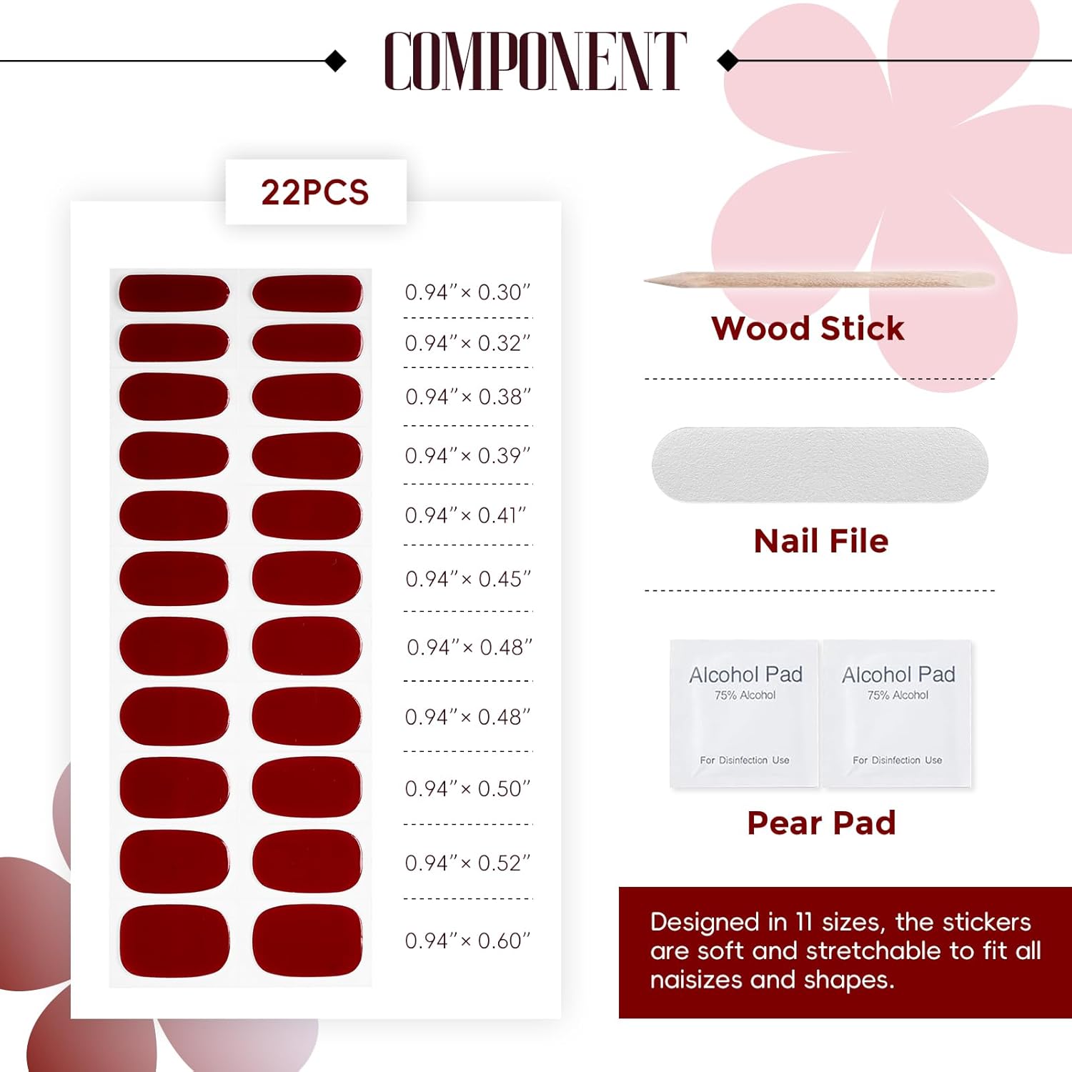 - ăGel Nail Sticker SetăThis no-bake gel nail sticker set includes 22 pcs of gel nail stickers in 11 distinct sizes, along with 2 preparation pads,a nail file,and a wooden stick