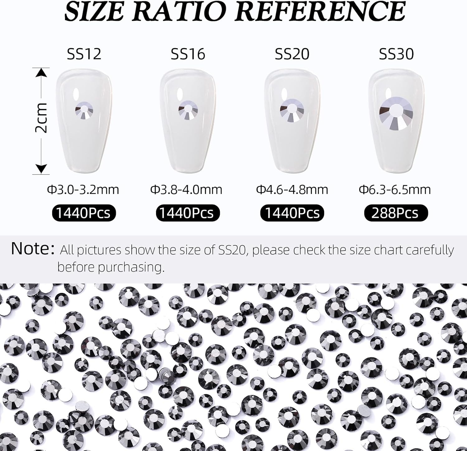 Black Hematite Flatback Rhinestones, Glass Rhinestones for Nail Art and Craft, Glue Fix, Loose Crystal Gemstones(Black Hematite, SS12, 1440pcs, 2.9-3.0mm)