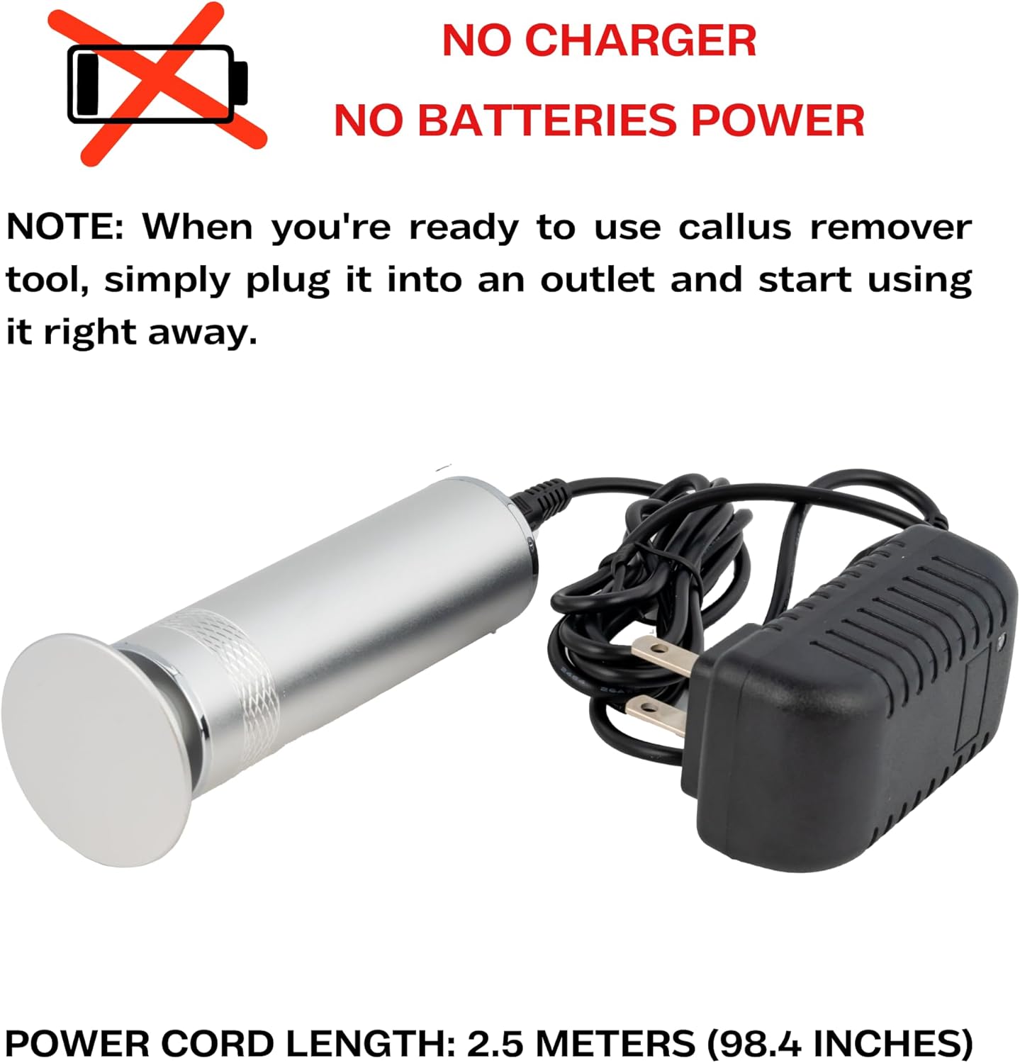 - 【NON BATTERY POWERED AND NO CHARGER】: The callus remover for feet machine does not use batteries or charge. The product plugs directly into the cord with a 2.5 meters long.