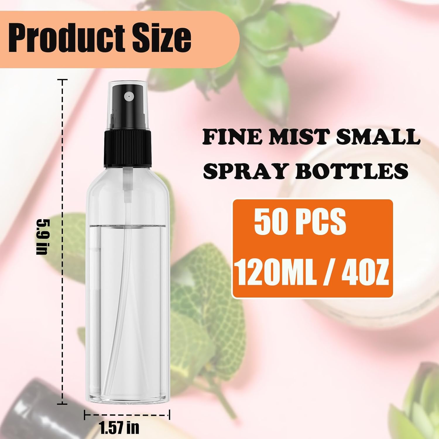 - 4OZ SPRAY BOTTLES PLASTIC FOR PERSONAL DAILY USE AND SMALL BUSINESS: Package includes 50 4 oz. small spray bottles with black mist sprayers; Bulk fine mist spray bottles are perfect for travel,business trips, home and office, and commercial activities; The plastic small spray bottles are not only commonly used for storing personal care liquids and sharing DIY homemade sprays with friends, but also the clear empty bottles are great for small business to make samples! For giveaways or sample sales