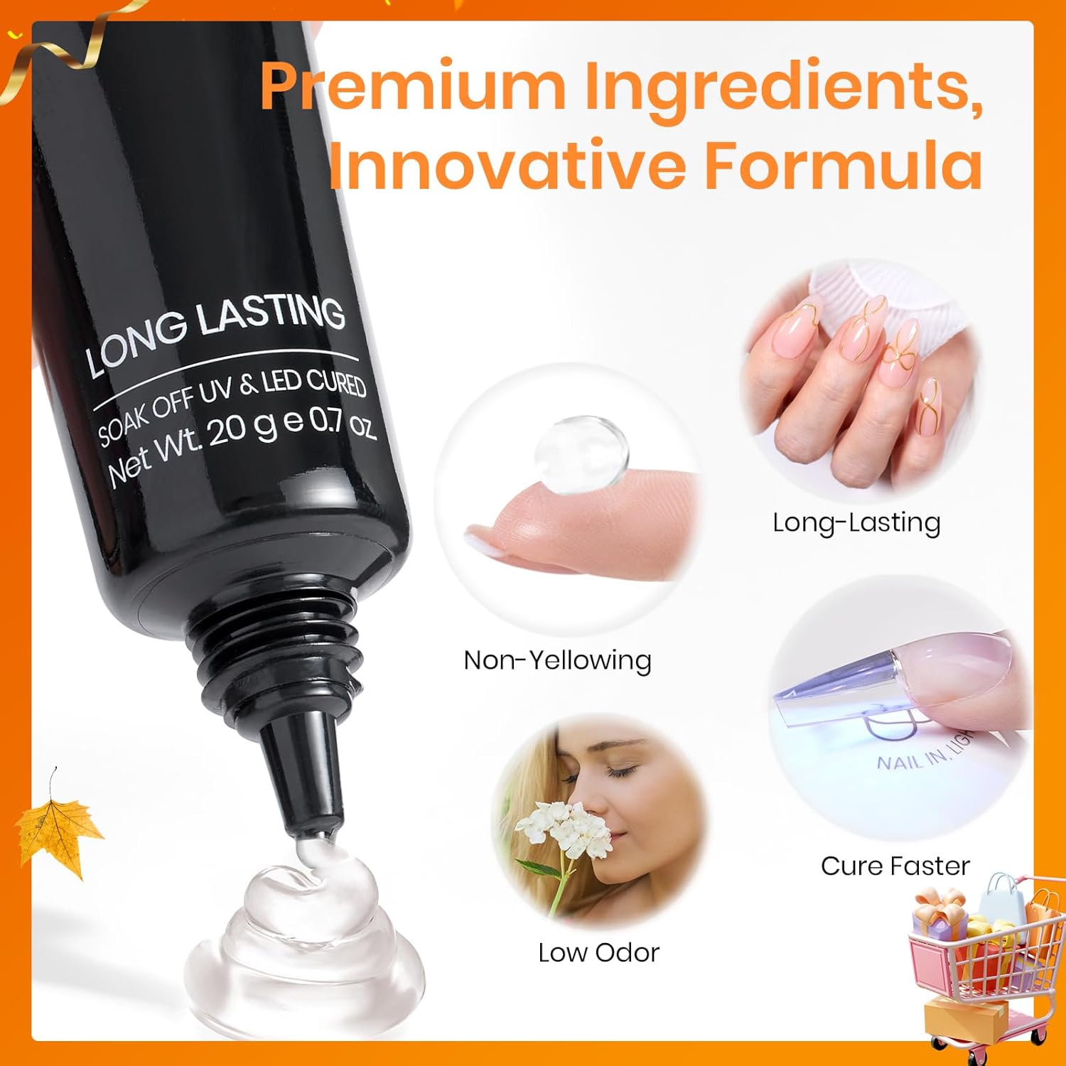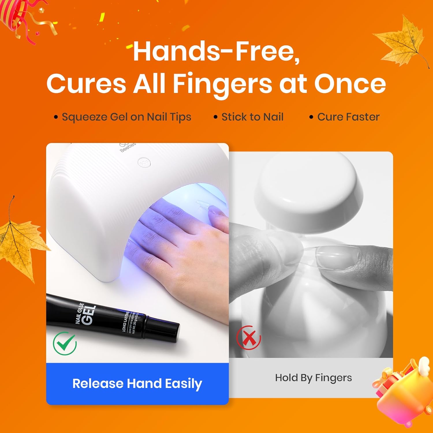 - Efficient &Convenient: Nail Glue Gel boasts a convenient hands-free design, enabling both manicurist and enthusiasts to apply nail tips without needing to hold them in place during the UV curing process. You can apply all five fingers at once and cure them together, effortlessly saving you up to five times the usual nail art time. Beetles Fall Nail Fest