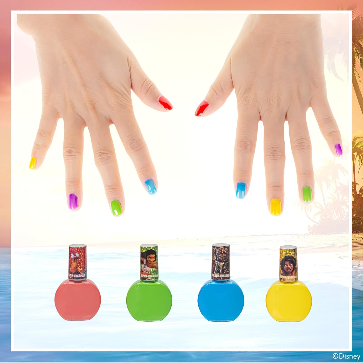 - SET INCLUDES: 18 bubble gum scented, peelable nail polish bottles with glittery and opaque colors. Shades include gold, red, yellow, pink, blue, purple, and so many more colors! Each bottle decorated with Moana, Maui, Pua, and more of her friends.