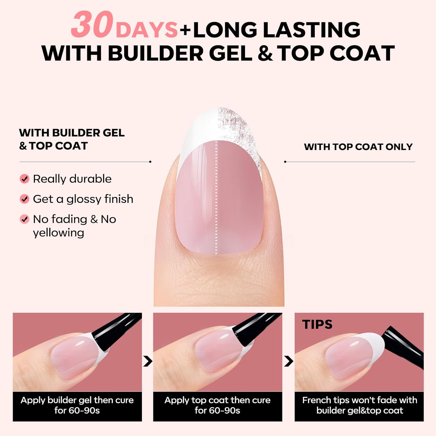 - Time & Money Saver: No base coat needed, just apply glue, complete with builder gel and top coat for professional-grade durability. Easily get salon-quality french press on nails in under 15 minutes and cheaper than salon nails, time and money saving.