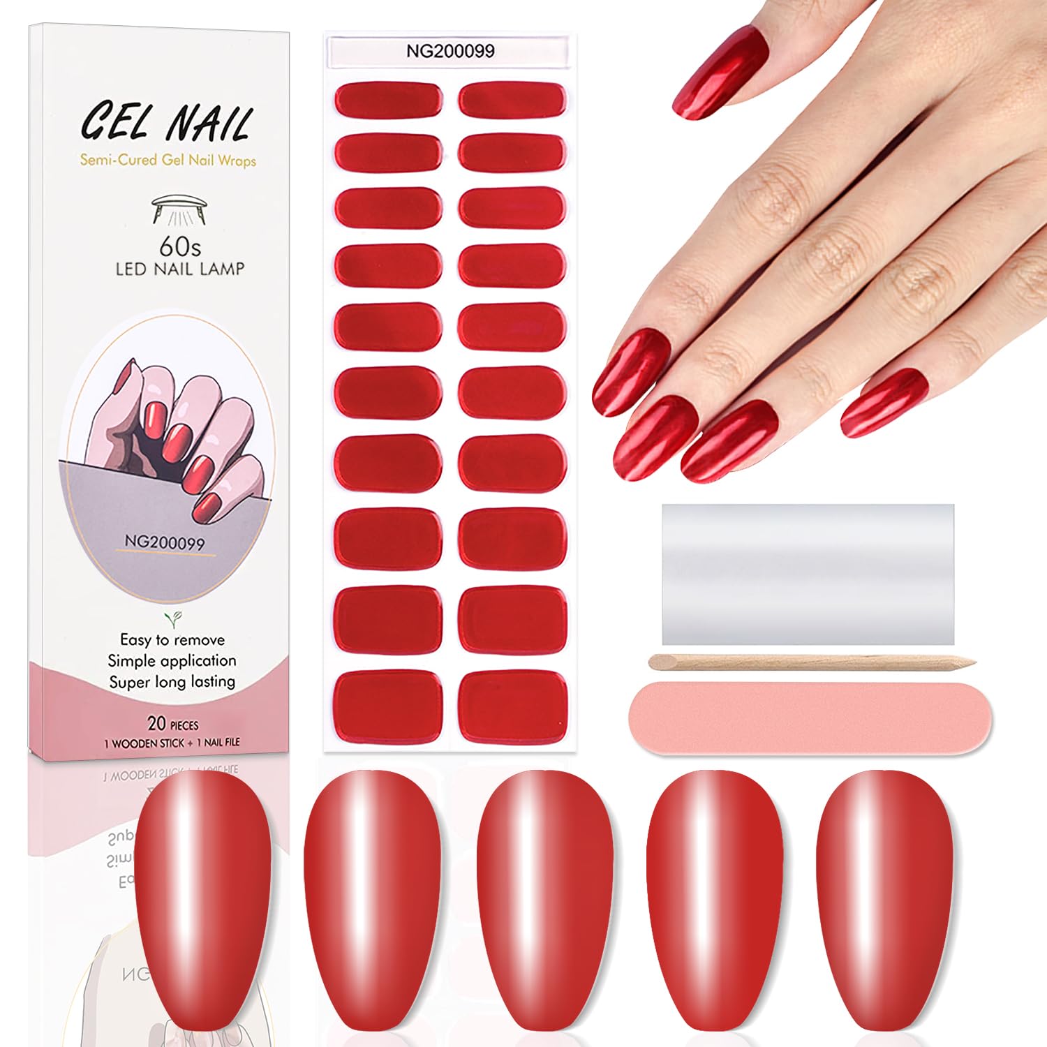 WOKOTO 20Pcs Chrome Red Gel Nail Strips with Nail File & Wooden Stick Holographic Red Semi Cured Nail Polish Strips UV Gel Nail Stickers Full Nail Wraps Stick On Nails Strips Decals for Women Girls