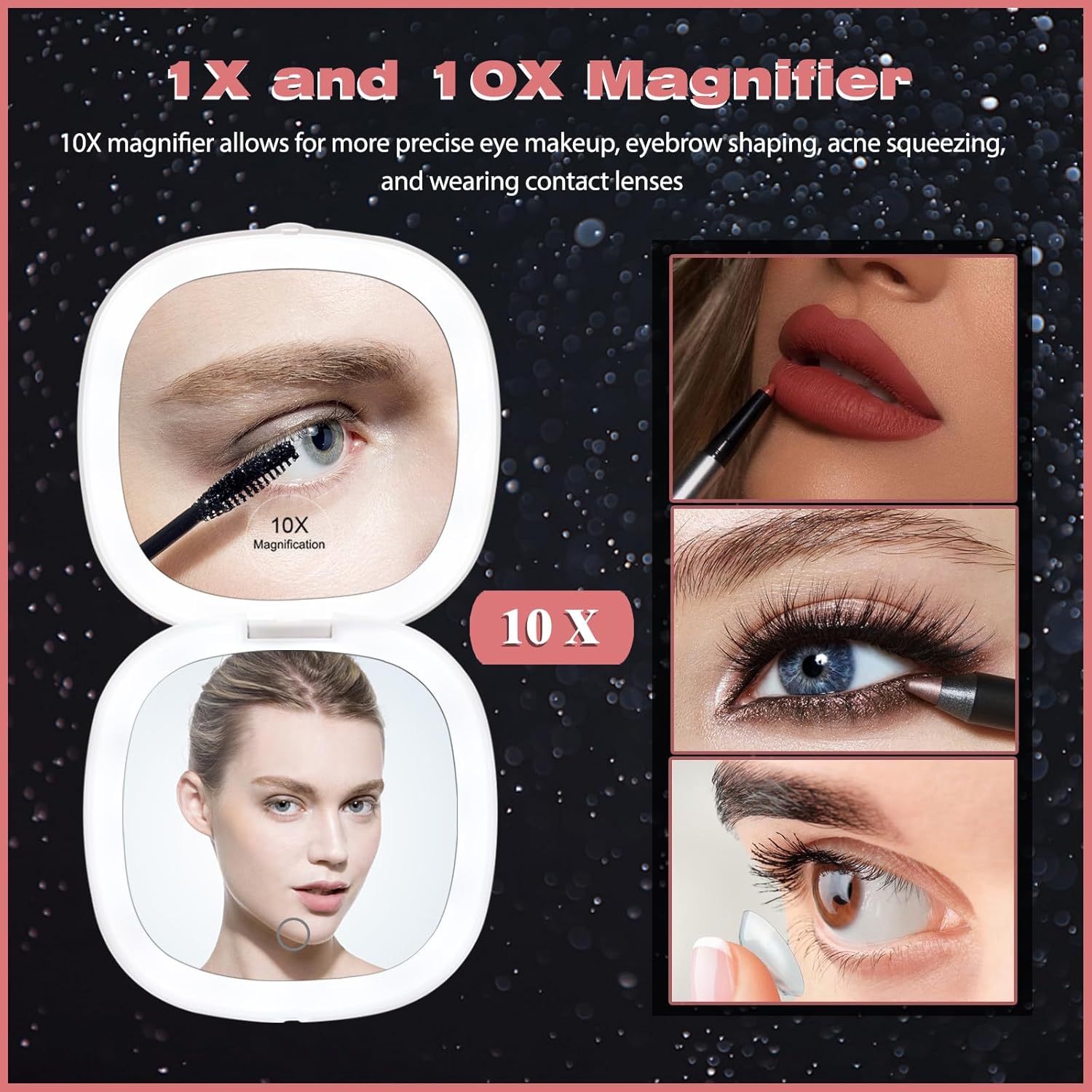 - 【DUAL-SIDED MIRROR WITH 10X MAGNIFICATION - PRECISION FOR EVERY DETAIL】This portable LED makeup mirror features a 10X magnifying mirror on one side, perfect for detailed tasks like applying mascara, eyeliner, or putting on contact lenses. The 1X normal mirror on the other side is ideal for everyday makeup and skincare routines. Whether you're perfecting your look or focusing on the finer details, this lighted travel mirror with magnification ensures you never miss a spot