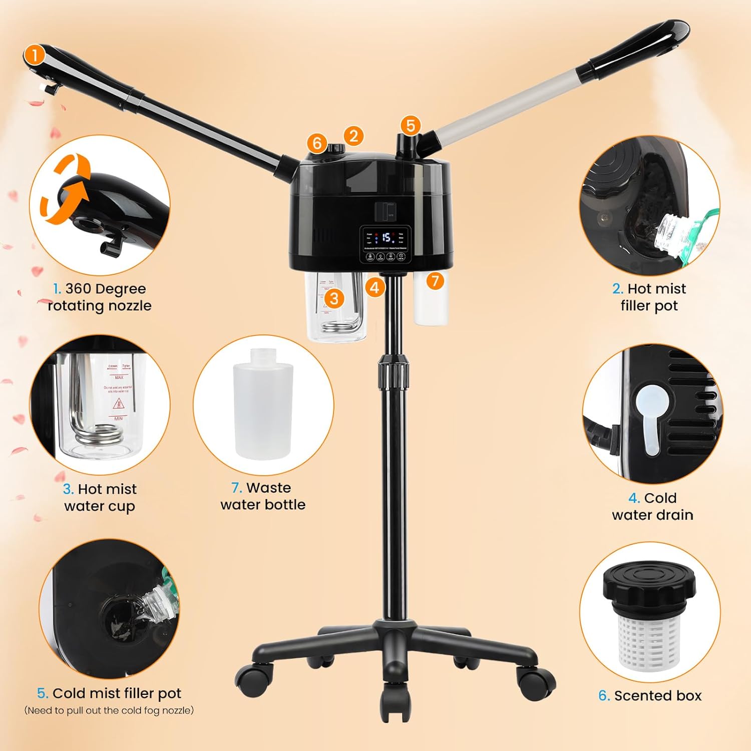 - Facial Steamer with Wheels: With five leg base and 5 quiet wheels, moves smoothly and quietly, and it can be easily Installation and disassembly, easy for cleaning