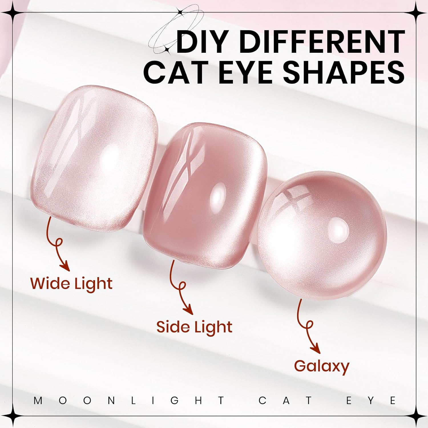 - Light Pink Cat Eye Gel Polish: 1*15ml(0.5fl oz) moonlight glassy cat eye gel nail polish with 1PC magnetic stick. Achieve a flawless application with no black spots, allowing the cat eye effect to shine through beautifully