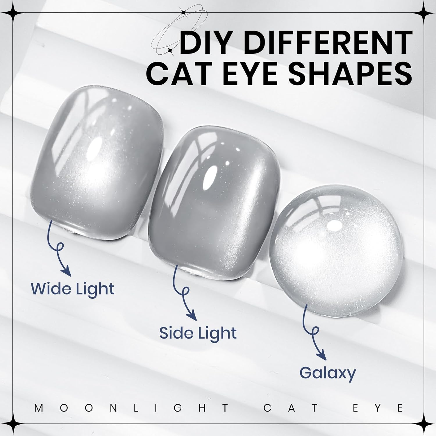 - Silver Cat Eye Gel Polish: 1*15ml(0.5fl oz) moonlight glassy cat eye gel nail polish with 1PC magnetic stick. Achieve a flawless application with no black spots, allowing the cat eye effect to shine through beautifully