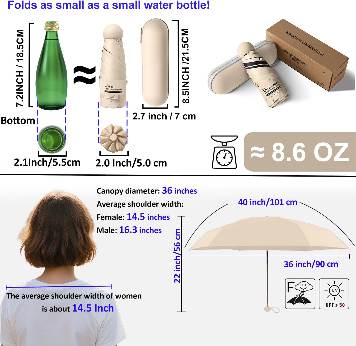- Pocket umbrella: With a 40-inch arc and a 35.4-inch diameter, this mini travel umbrella is perfect for concealing in your purse or bag when youβre on the go! Folds to an ultra-compact 6.9 inches, makes the umbrella great for travel, as this super lightweight umbrella collapses about the size of your palm