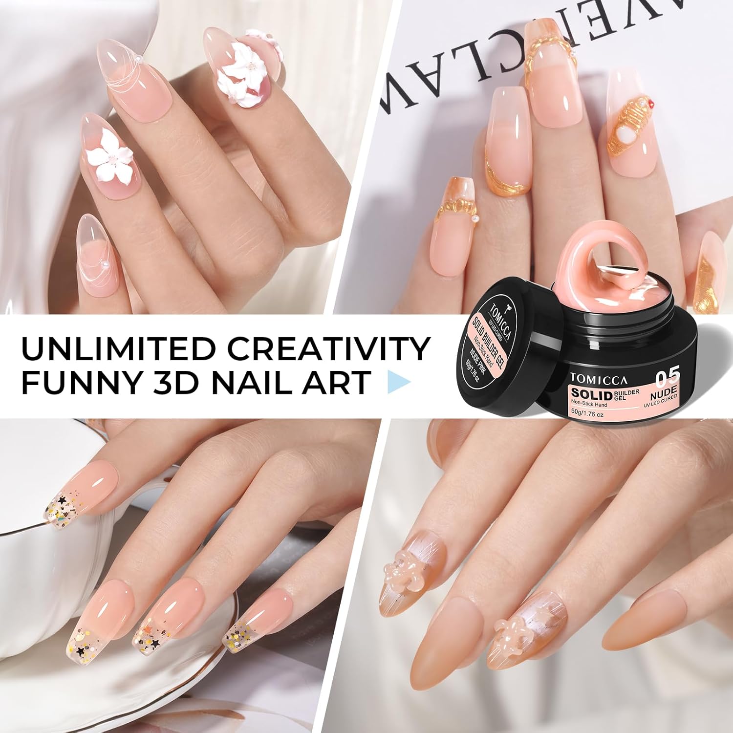 - 5-in-1 Solid Builder Nail Gel:TOMICCA nail sculpting gel can be used as nail extensions, 3D engraving,mix with glitter, enhances magic mirror powder effects and flower craved for dazzling nail art. Elevate your manicure with TOMICCA versatile glue gel today!