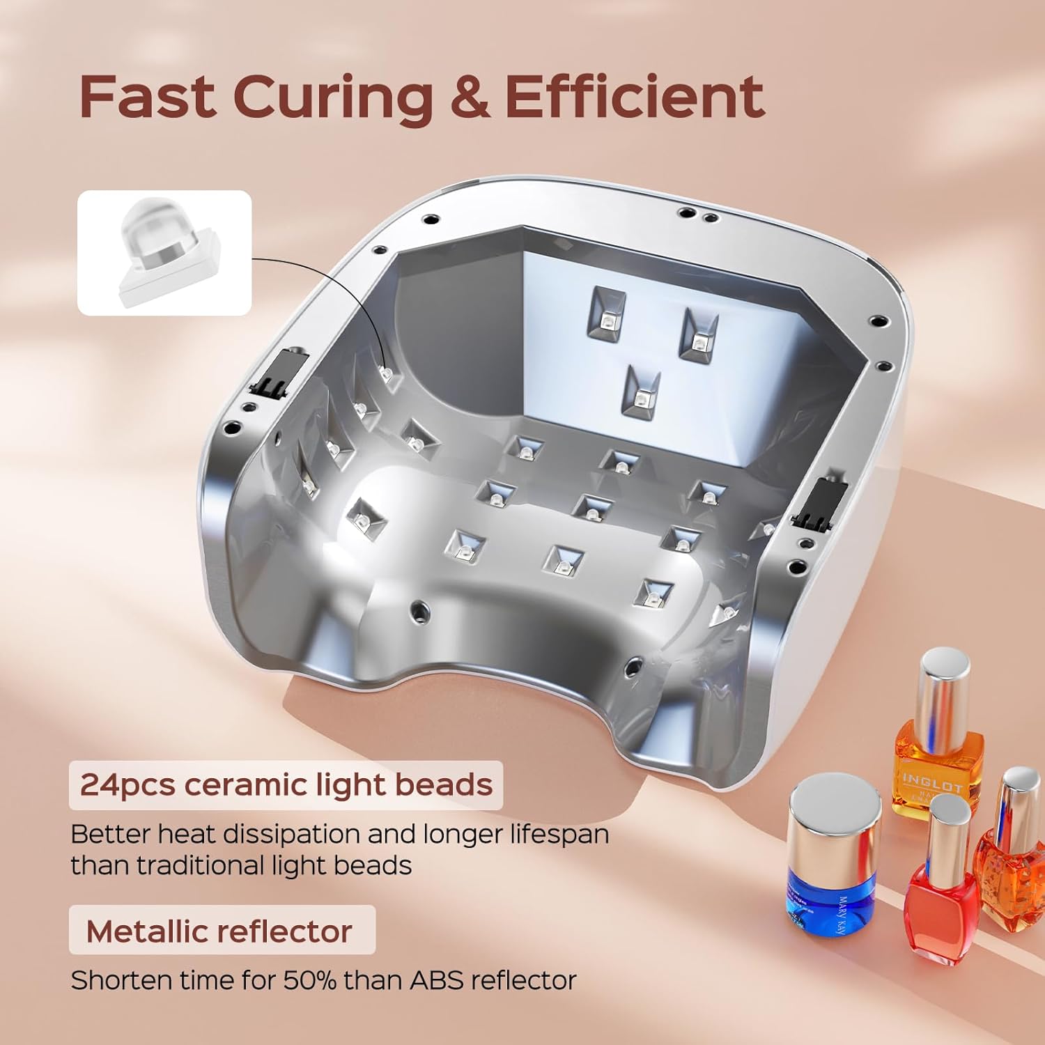 - [Smart Sensor and Adjustable 4 Timers] Built-in infrared sensor lights, the UV LED nail lamp automatically turns on when you place your hand or foot inside, and turns off when you take it out. It is adjustable in 4 timer settings of 15s/30s/60s/99s, which can be selected according to the time for different gel nails.