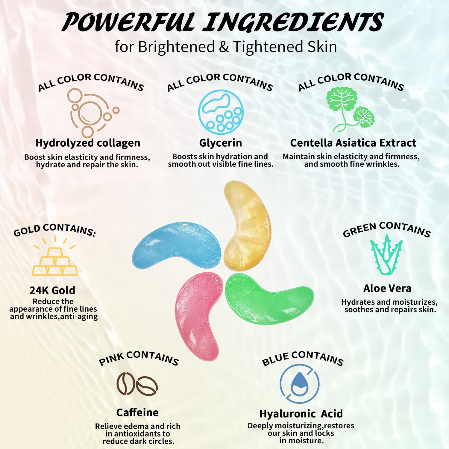 - Safe & Effective Ingredients: Our under-eye patches are infused with a powerful blend of collagen, hyaluronic acid, caffeine, and natural plant extracts which work together to deeply repair, soothe, rejuvenate, and protect the delicate skin around your eyes โ without any irritation. The ingredients of our under eye patches for dark circles and puffy eyes are vegan, sulfate-free, and gentle on all skin types.