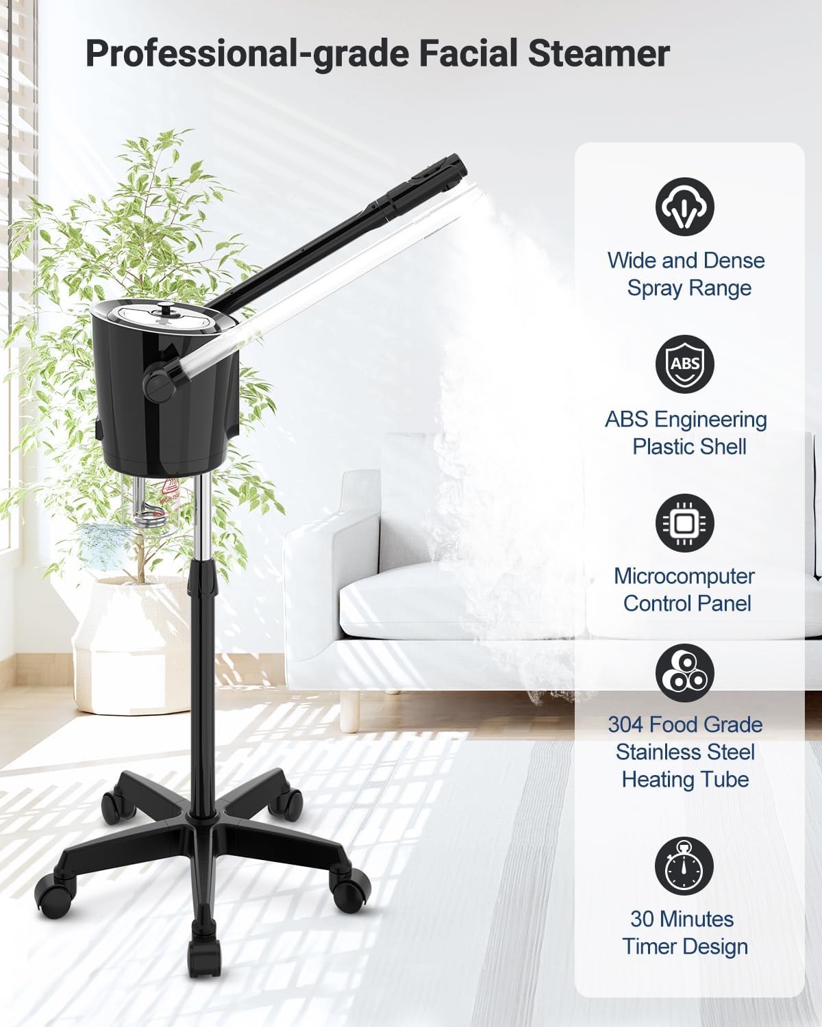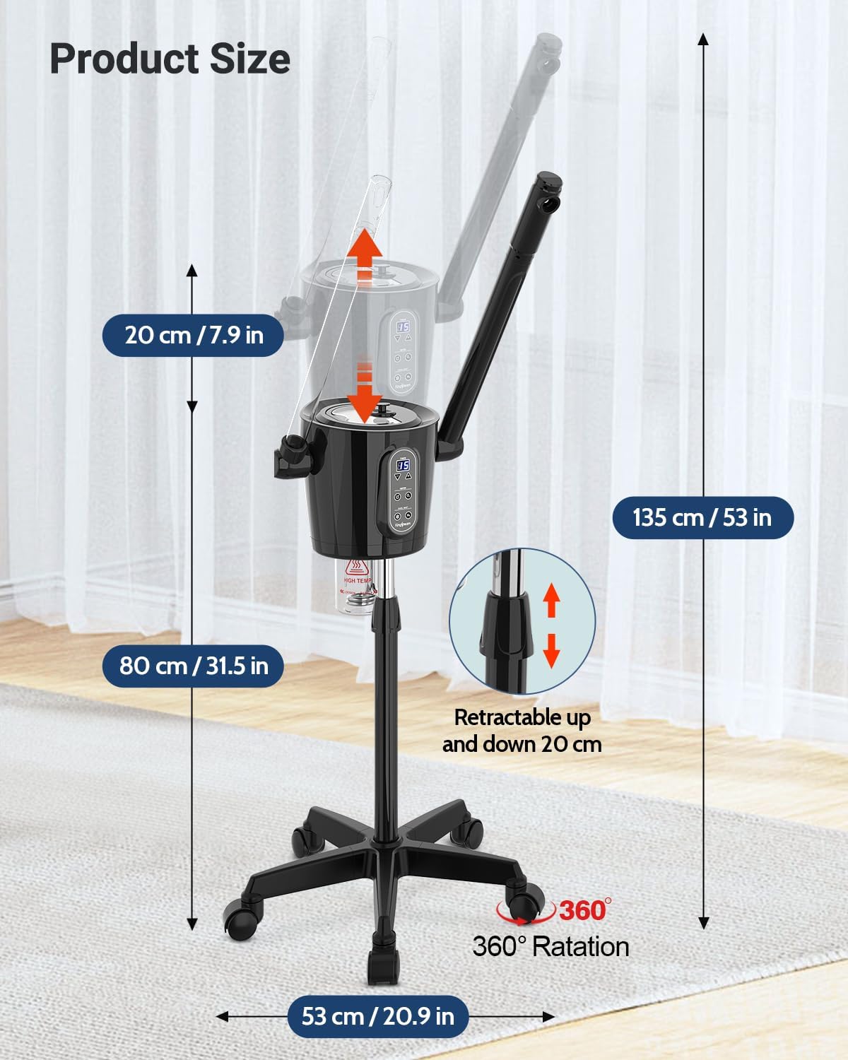 - [Practical & Easy-to-Use Design] The Kingsteam facial steamer features a 360Β° rotating nozzle, adjustable arm, and height-adjustable mobile stand with a telescopic tube, designed to accommodate your different needs and settings. Whether sitting or lying down, you can easily enjoy spa treatments for your face and neck. The detachable water cup is simple to clean, and we recommend changing the water regularly for optimal performance. The stable, mobile stand with wheels allows for easy movement and secure positioning