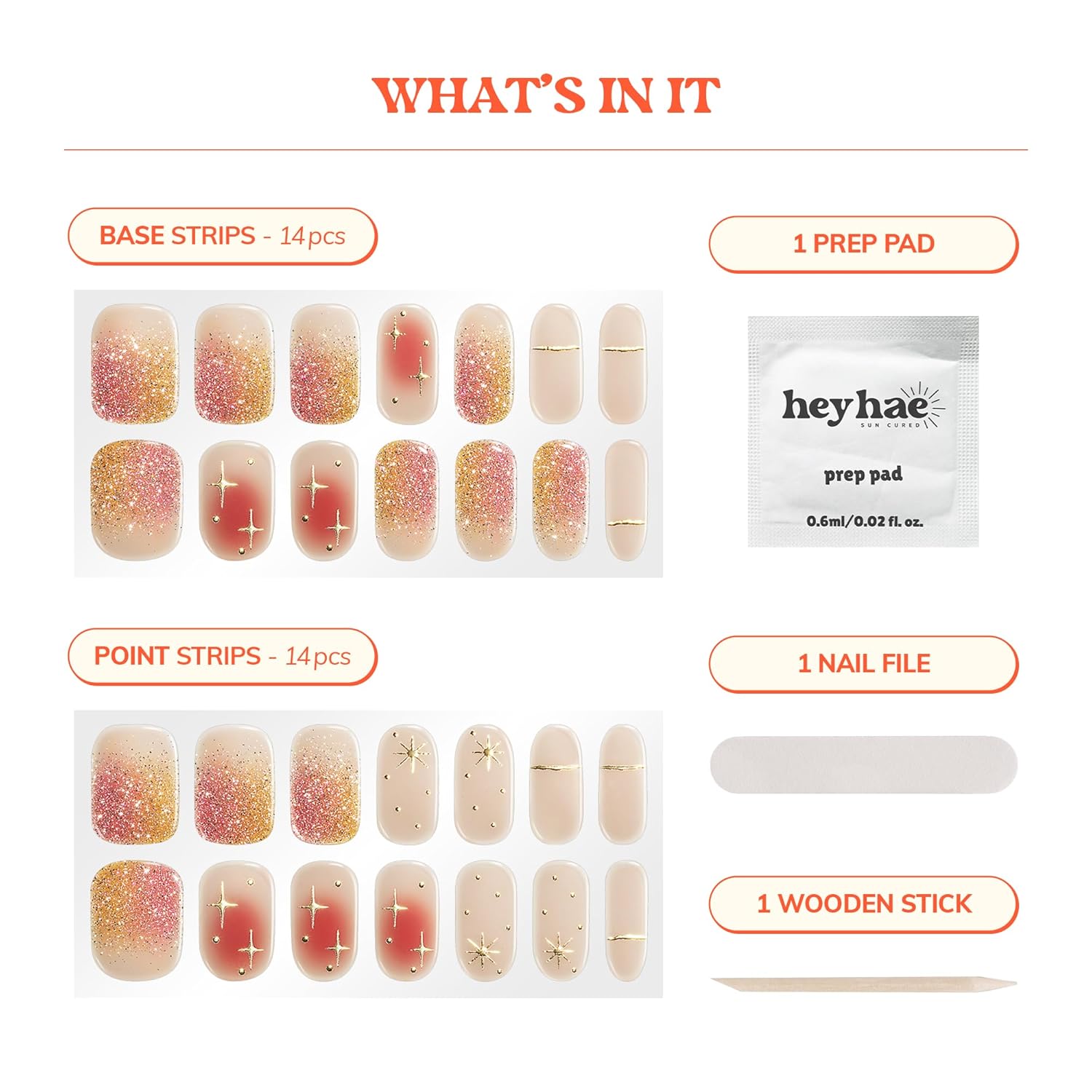 Semi Cured Gel Nail Strips | No LED Lamp Needed | Ombre, Gold, Spring | Easy Apply & Remove, Salon Quality | Includes 28 Strips, 1 Prep Pads, Nail File & Wooden Stick - Hey, It's Golden Hour