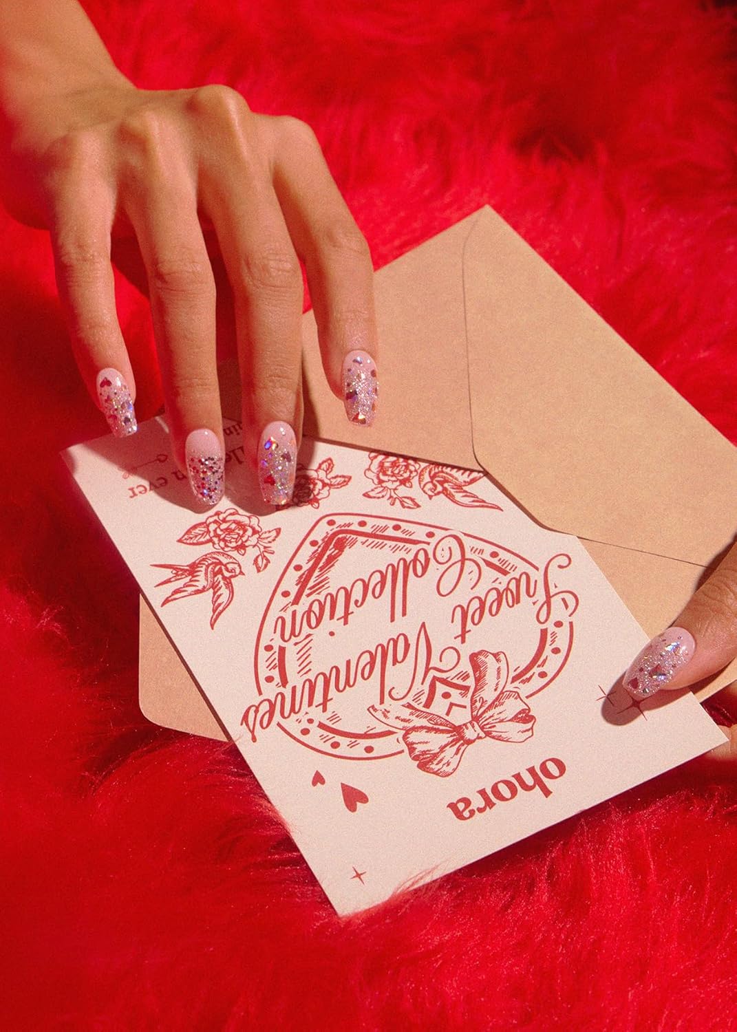 ohora Semi Cured Gel Nail Strips (N Love Bomb) - Pink, Glitter, Works with Any UV/LED Lamps, Salon-Quality, Long Lasting, Easy to Apply & Remove - Includes 2 Prep Pads, Nail File & Wooden Stick