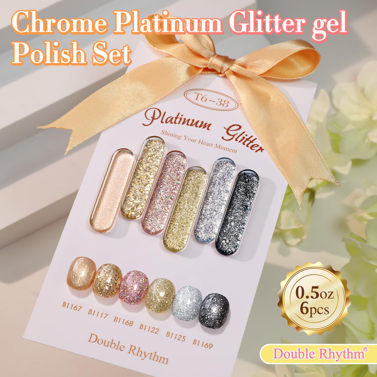 Double Rhythm 0.5 Oz Glitter Gel Polish Set of 6 Color with Display Borad 15 ml Full Size Kit Shimmer Reflective Sparkle Soak Off Manicure Salon DIY at Home (Rose Gold Silver Black Bright-T6-38)