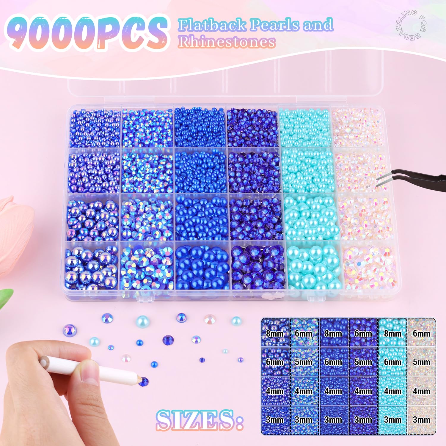 9000Pcs Flatback Pearls and Rhinestones for Crafting, Blue Series Mixed Size 3-8mm Resin Rhinestones and Half Pearls for Bedazzling, Nail Art with Tweezers and Pickup Pencil