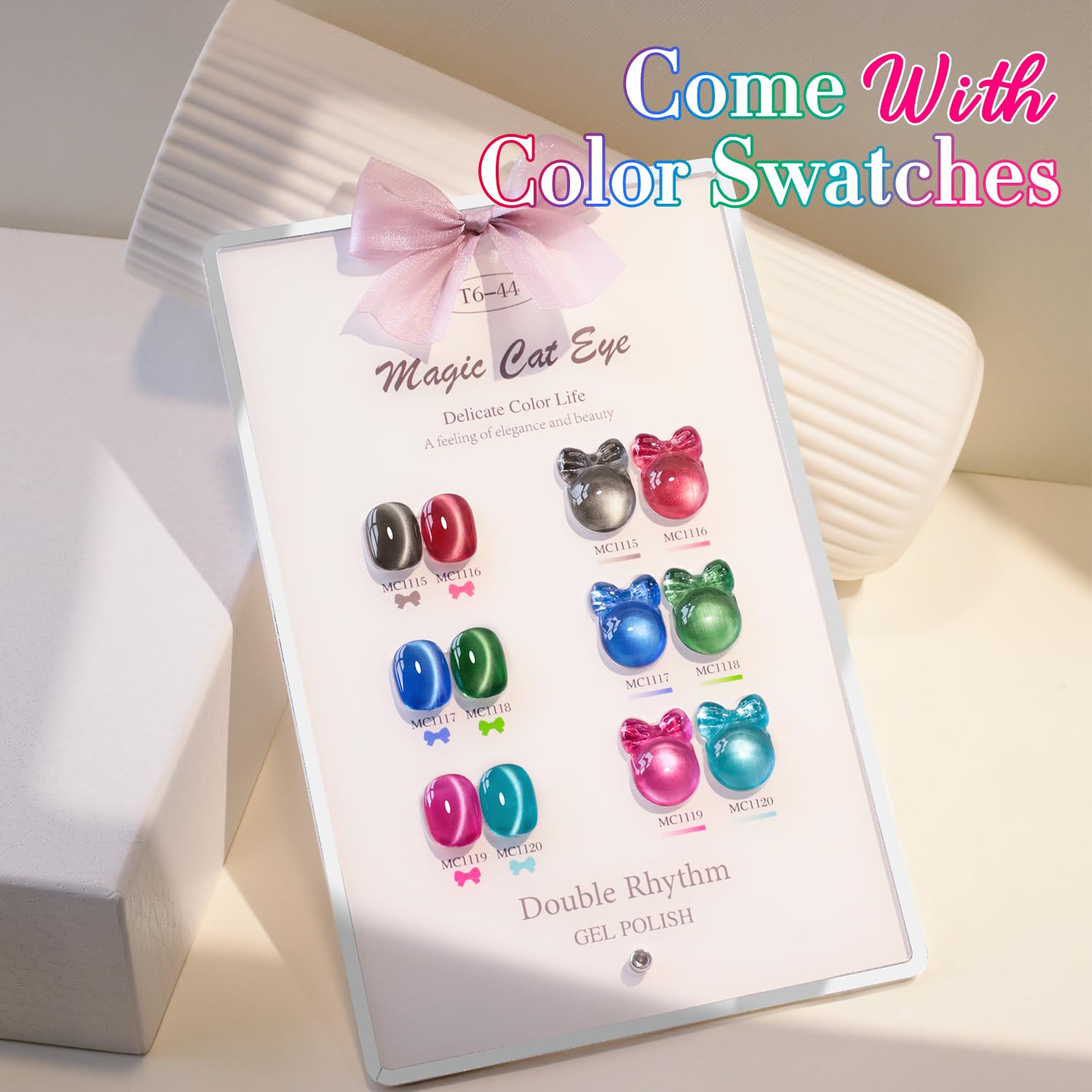 Double Rhythm Cat Eye Gel Nail Polish Set of 6 Same Color Same Bottle 0.5 Oz Shimmer Glitter with Magnet Holographic Reflective Magnetic UV Polish Kit at Home (Black Red Green Navy-T6-44)