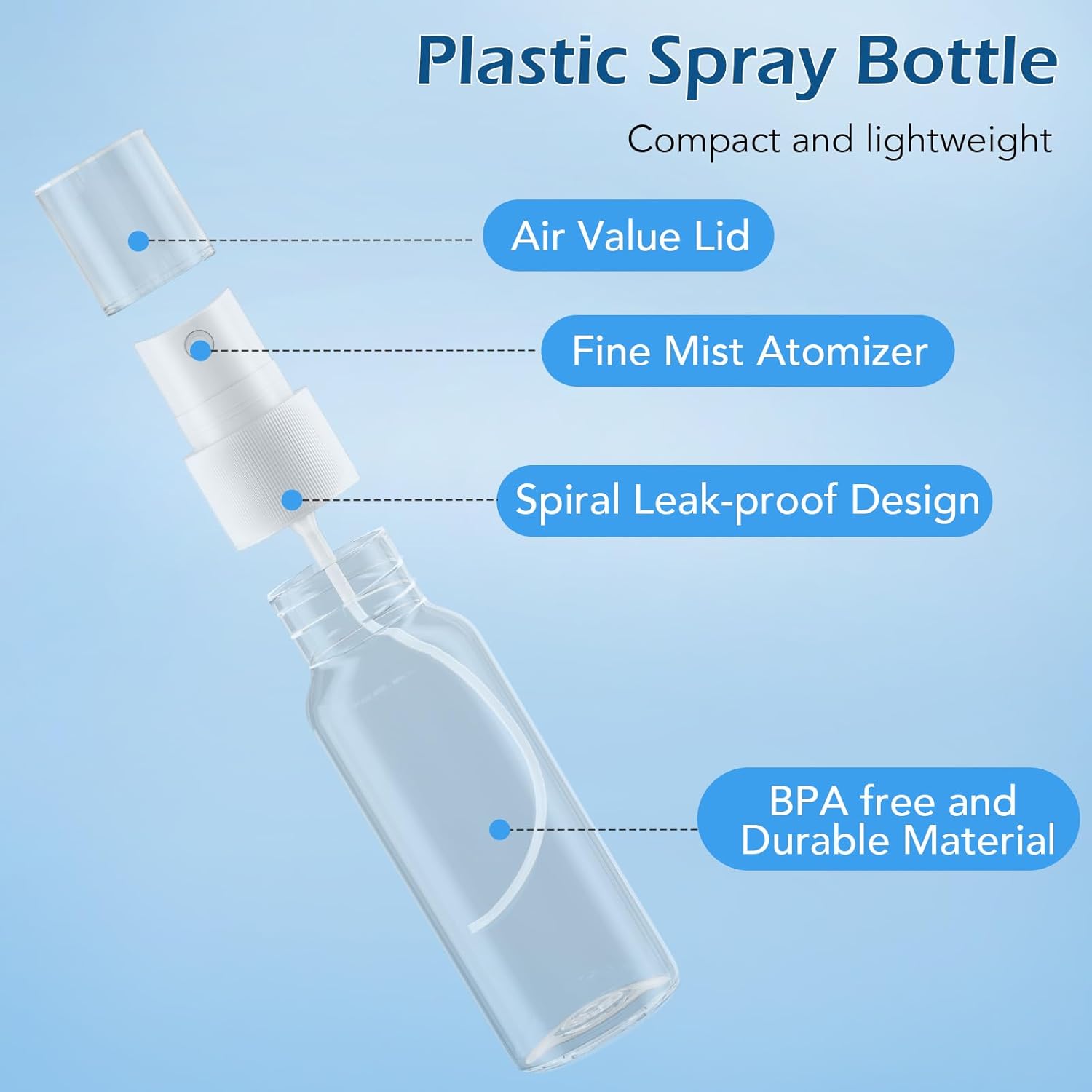 Spray Bottles, 1oz/30ml Clear Empty Fine Mist Plastic Mini Travel Bottle Set, Small Refillable Liquid Containers with 2pcs Funnels and 24pcs Labels (12 Pack)