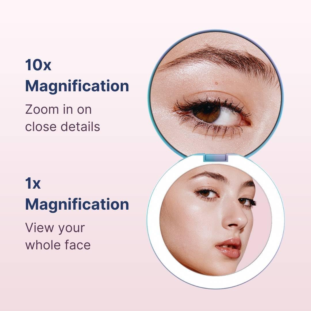 - Double-sided magnification (1x and 10x) so you can apply a full face of makeup, do a quick touch-up on the go, or focus on a detailed task like tweezing or inserting contact lenses
