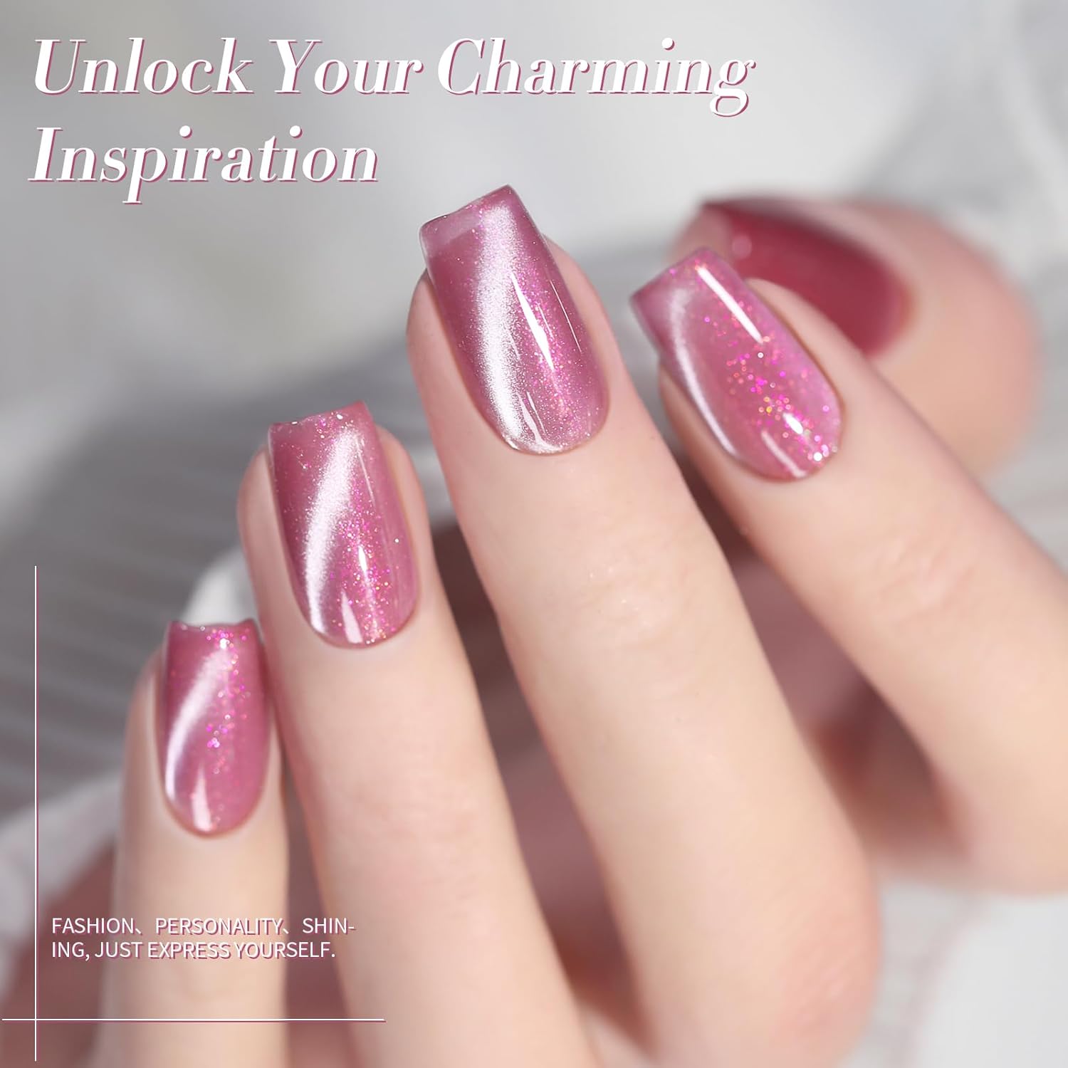 BORN PRETTY Cat Magnetic Eye Gel Nail Polish, Pink Glitter Cat Magnetic Gel Nail Polish, Midnight Rose Magnetic Nail Polish for Nail Art Manicure Salon DIY at Home 15ML