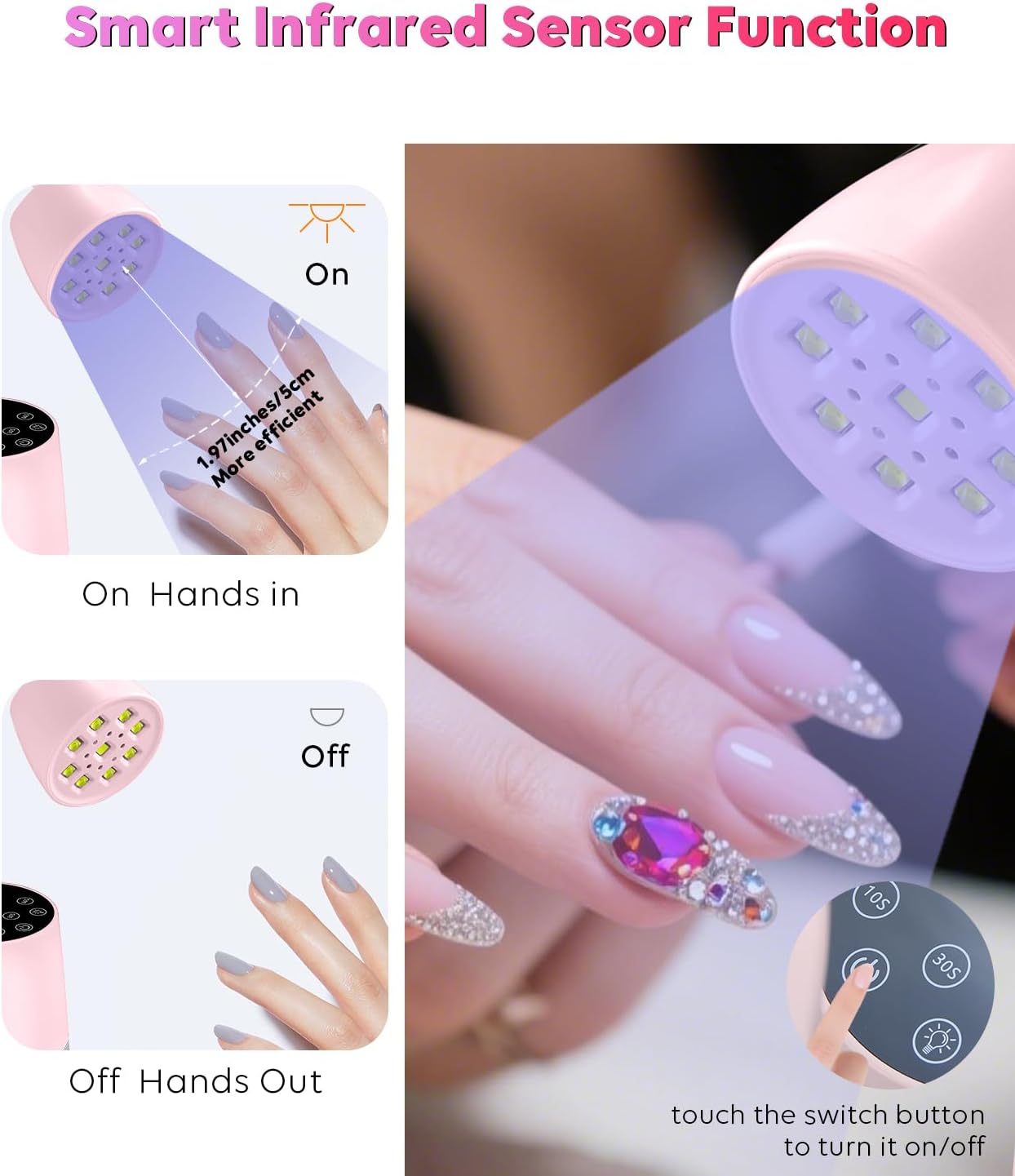 - AUTO Infrared Sensor UV Nail Lamp: This nail cure lamp is equipped with a built-in infrared sensor lights, just one touch, you can easily start the nail art lamp and enter the auto-sensing mode, hands in light on, hands out light off, ideal for both home and salon use. It intelligently starts from the last selected timer, no need to reset the timer,convenient and time-saving