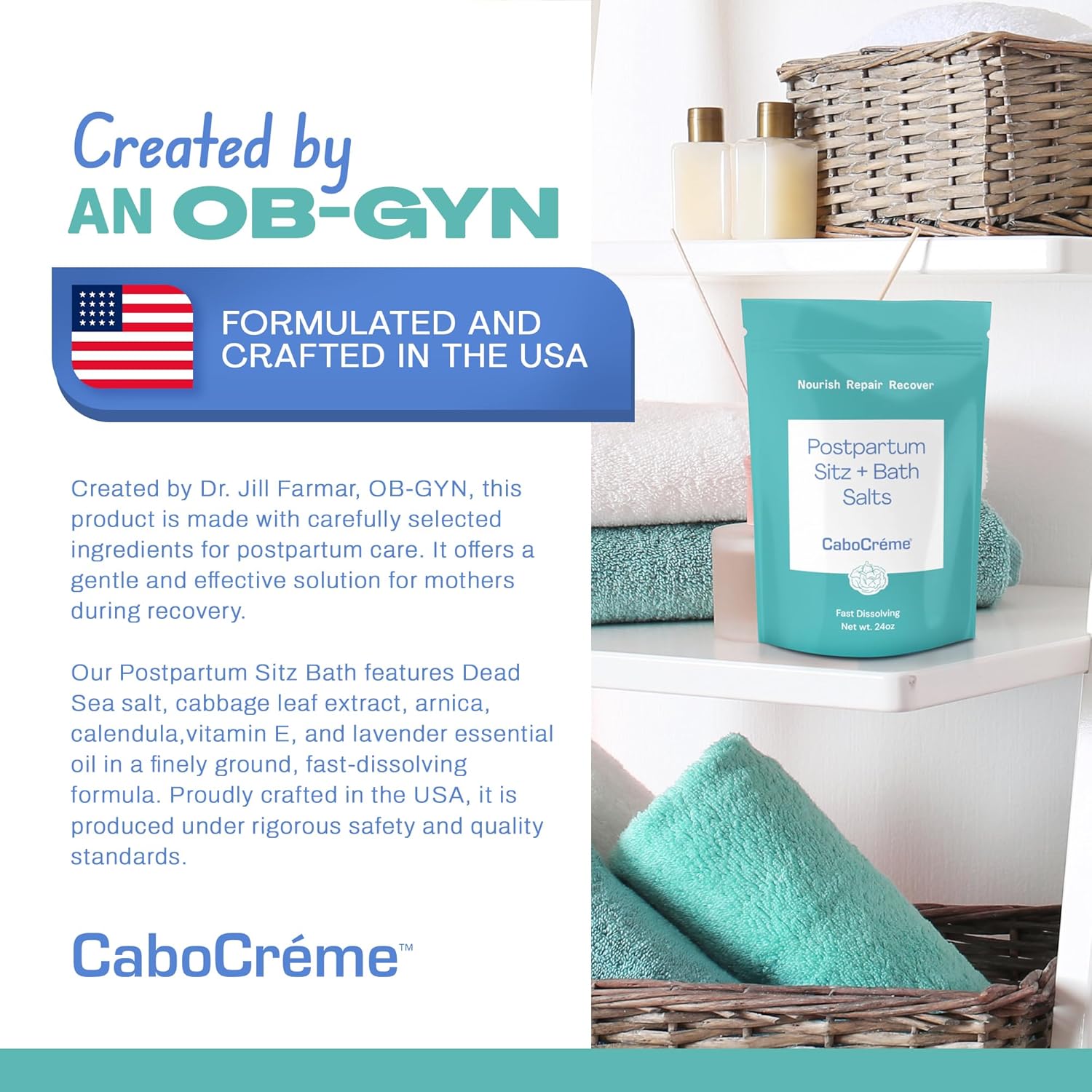CaboCréme Postpartum Sitz + Bath Salts – 24oz – Postpartum Bath Soak for Perineal Care, Healing Tears, Swelling & Hemorrhoids – Dead Sea Salt with Magnesium, Arnica, Calendula + Cabbage Extract