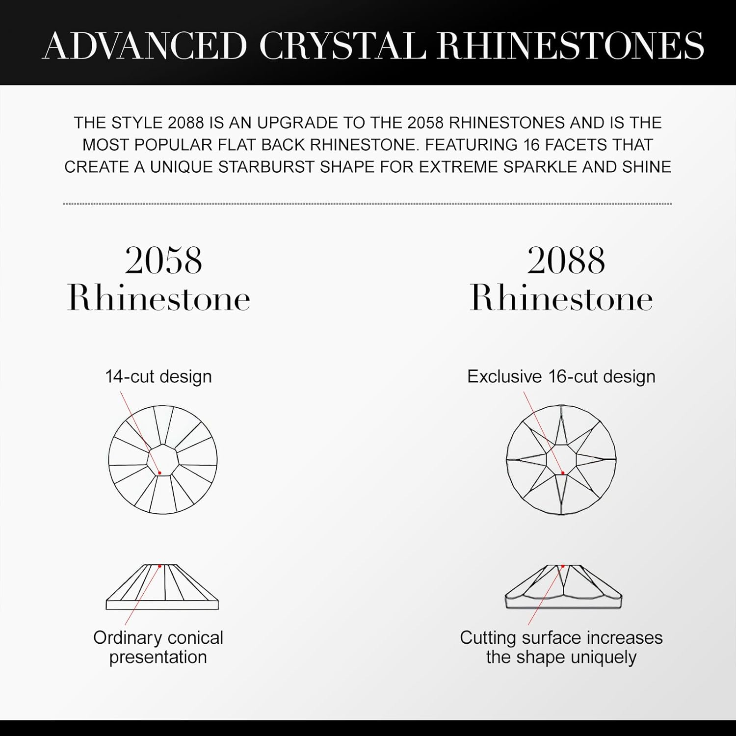 - ADVANCED CRYSTAL RHINESTONES: Novani style 2088 Flat Back rhinestones are the latest style of flat back rhinestones created by the leading rhinestone manufacturer. The style 2088 is an upgrade to the 2058 rhinestones and is the most popular flat back rhinestone. featuring 16 facets that create a unique starburst shape for extreme sparkle and shine.
