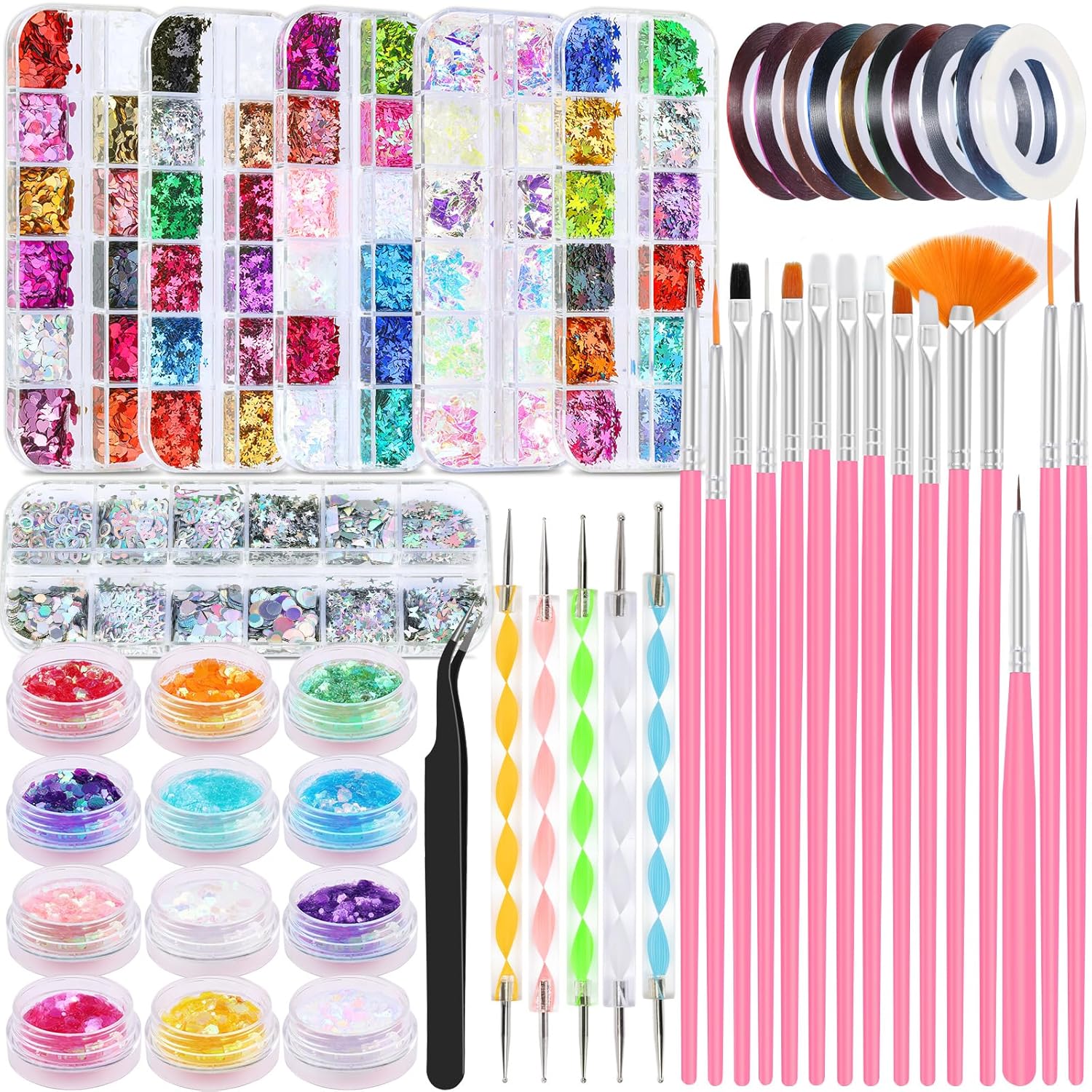 - Nail Art Decoration Kit: You will receive a nail art charms set, it contains 15pcs nail art brushes, 5pcs dotting pens, 10 colors of striping tape, 1 box 12 colors of nail art sequins, 5 boxes of laser holographic flakes (hearts, stars, maple leaves, butterflies, letters), 1 box irregular iridescent ice slag nail glitter flakes and a tweezer. This complete nail art set is perfect for nail art beginners and enthusiasts, it's easy to start a delightful nail art salon at home.