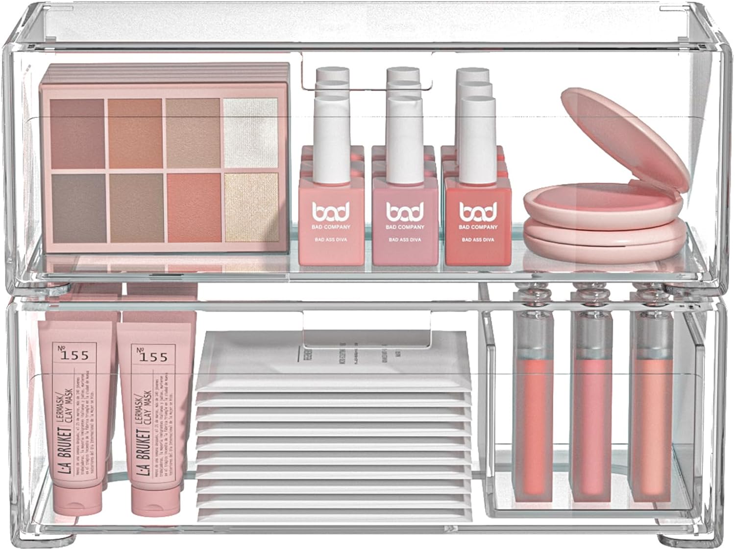 Stackable Storage Drawers Clear Plastic Storage Bins Bathroom Drawer Organizer Medicine Cabinet Organizer Makeup Organizers w Removable Divider Home Workspace Office Desktop Vanity Gift Idea 2Pack