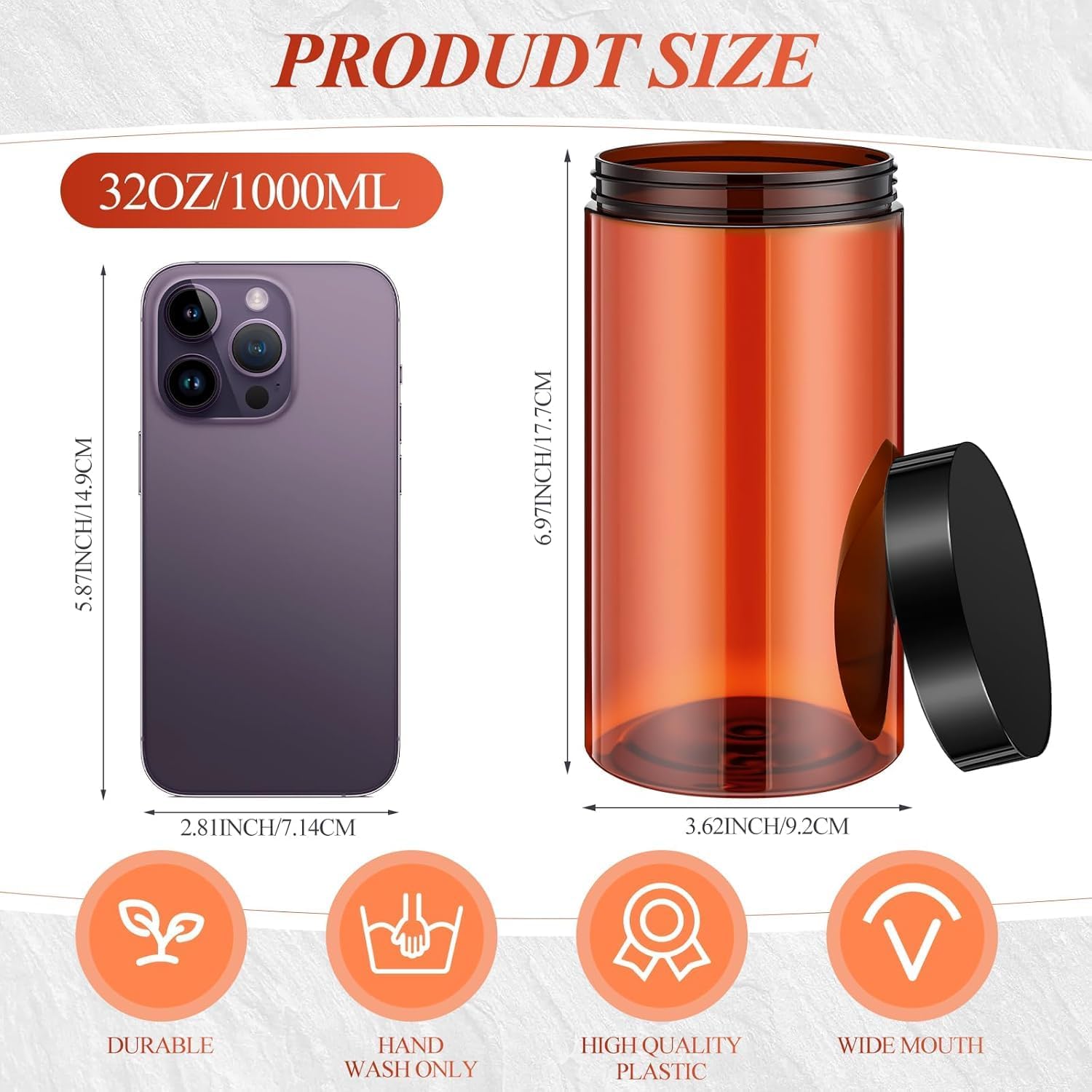- Product size: each wide-mouth plastic containers jars measure 9.2 cm/ 3.62 inches in diameter, 17.7 cm/ 6.97 inches in height wide, the volume is 32 oz; These are empty jars, great for meal preparation, condiments, DIY crafts, creams, butters, lotions and others