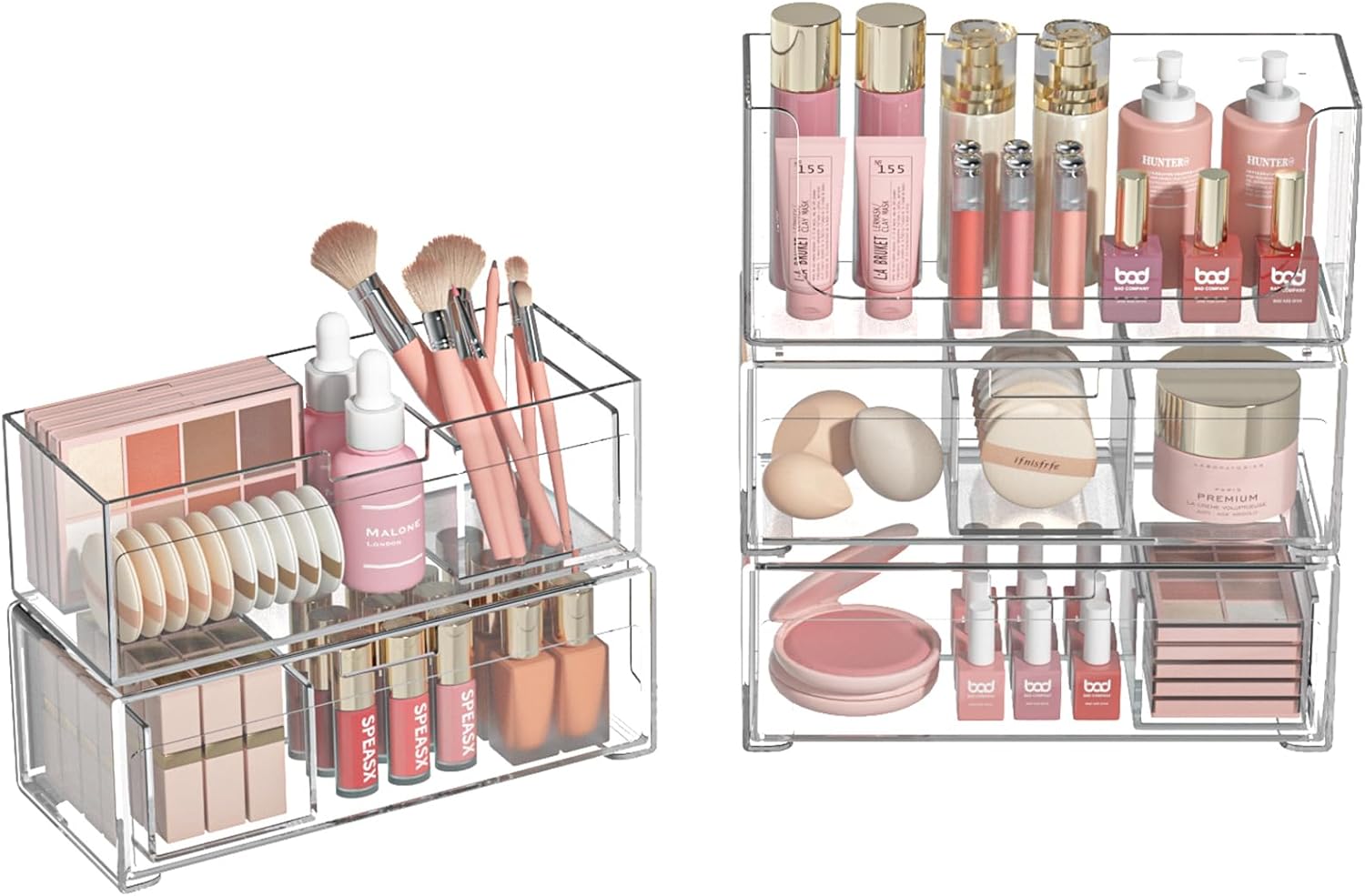 - DESKTOP ORGANIZER WITH DRAWERS: thanks to its two-in-one design, our clear organizer drawers storage box can be used as a drawer box to keep your daily essentials well organized and dustproof, or separated into two open storage holders without lids. This bathroom drawer organizer features a crystal clear body with a sleek cover for easy access and placing the items without obstruction