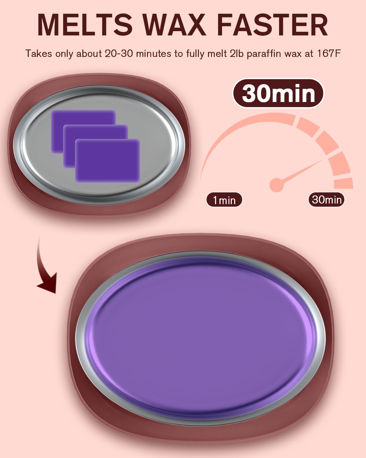 - Large Capacity / Quick Heat: paraffin wax machine has a large opening inner container , which offers you enough space to dip your hands, elbows or feet in paraffin warmer machine. Melts wax quickly and evenly , takes just 30 minutes to fully melt 2 lbs of paraffin wax at 167 °F. Turn Off the machine when dipping
