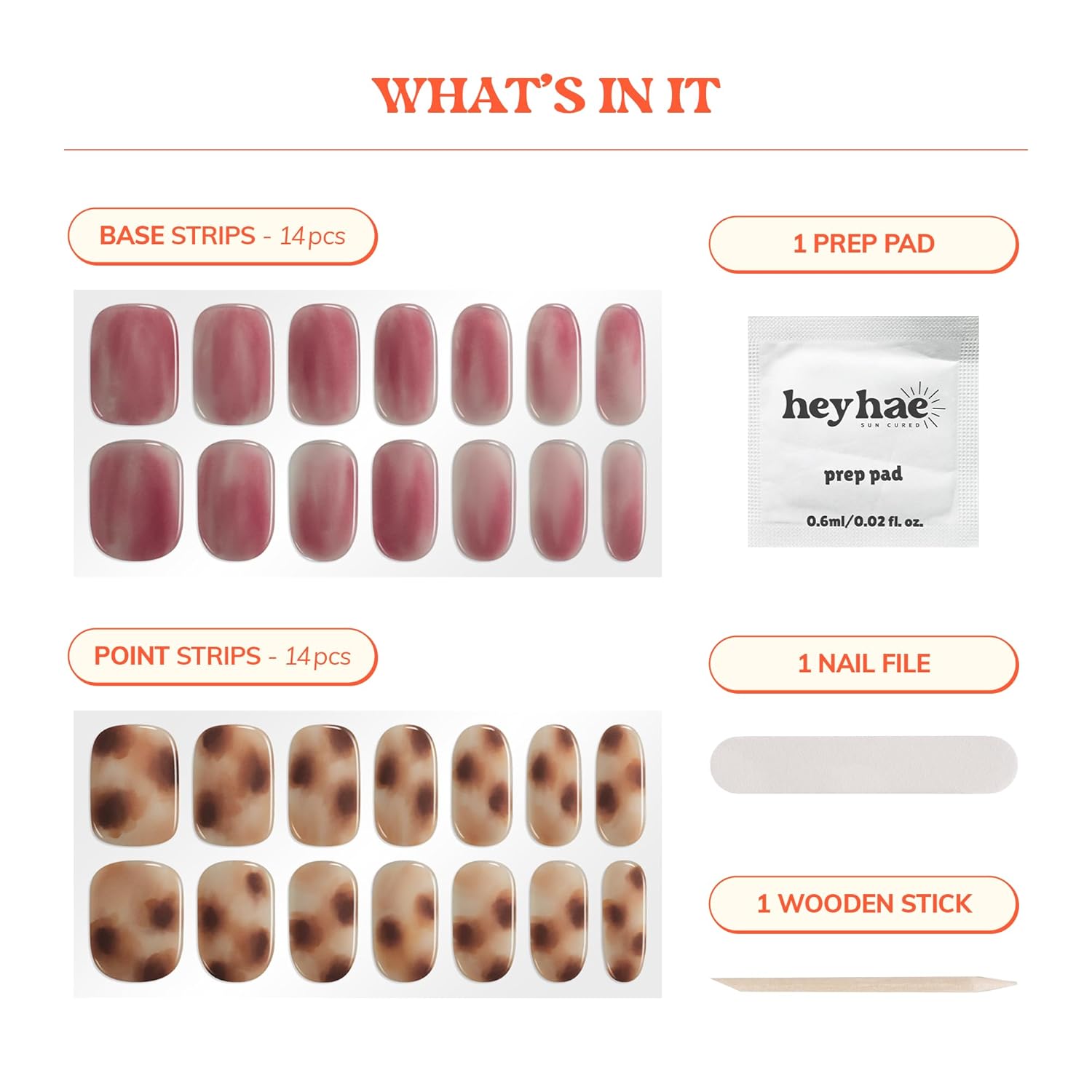 - Enjoy a complete package of fresh salon quality nails done at ease everywhere and anywhere you go! Package includes: 28 strips, 1 Prep pad, 1 Nail file, & 1 Wooden stick.