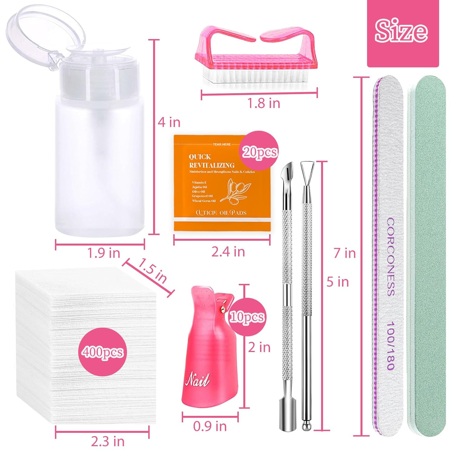 - Complete Gel Nail Polish Remover Kit: Our professional nail polish remover kit comes with everything you need to safely and effectively remove gel nails and acrylic nails at home, including 10pcs soak-off nail clips, a 100ml empty push down pump bottle, 100/nail files, 400/4000 buffers, a triangular cuticle scraper, and a dual-ended nail pusher, 400pcs lint free wipes,saving you time and money compared to salon visits.
