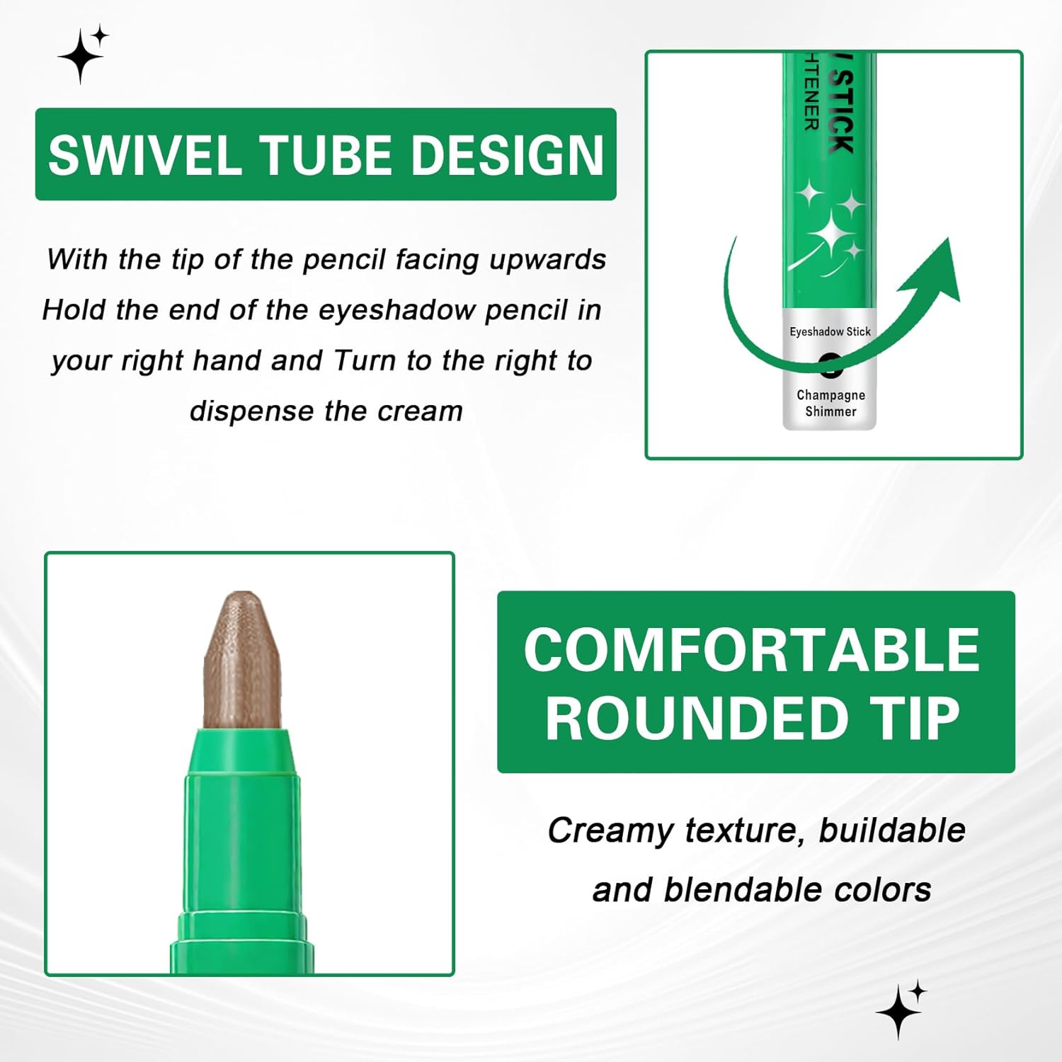 - ăEye Shadow Sticksă8-color eye shadow sticks include 6 shimmering shades of Champagne,Pearl,Taupe,Bronze,Cocoa,Smoky Amethyst and 2 matte shades of Stone and Putty to meet your eye makeup needs
