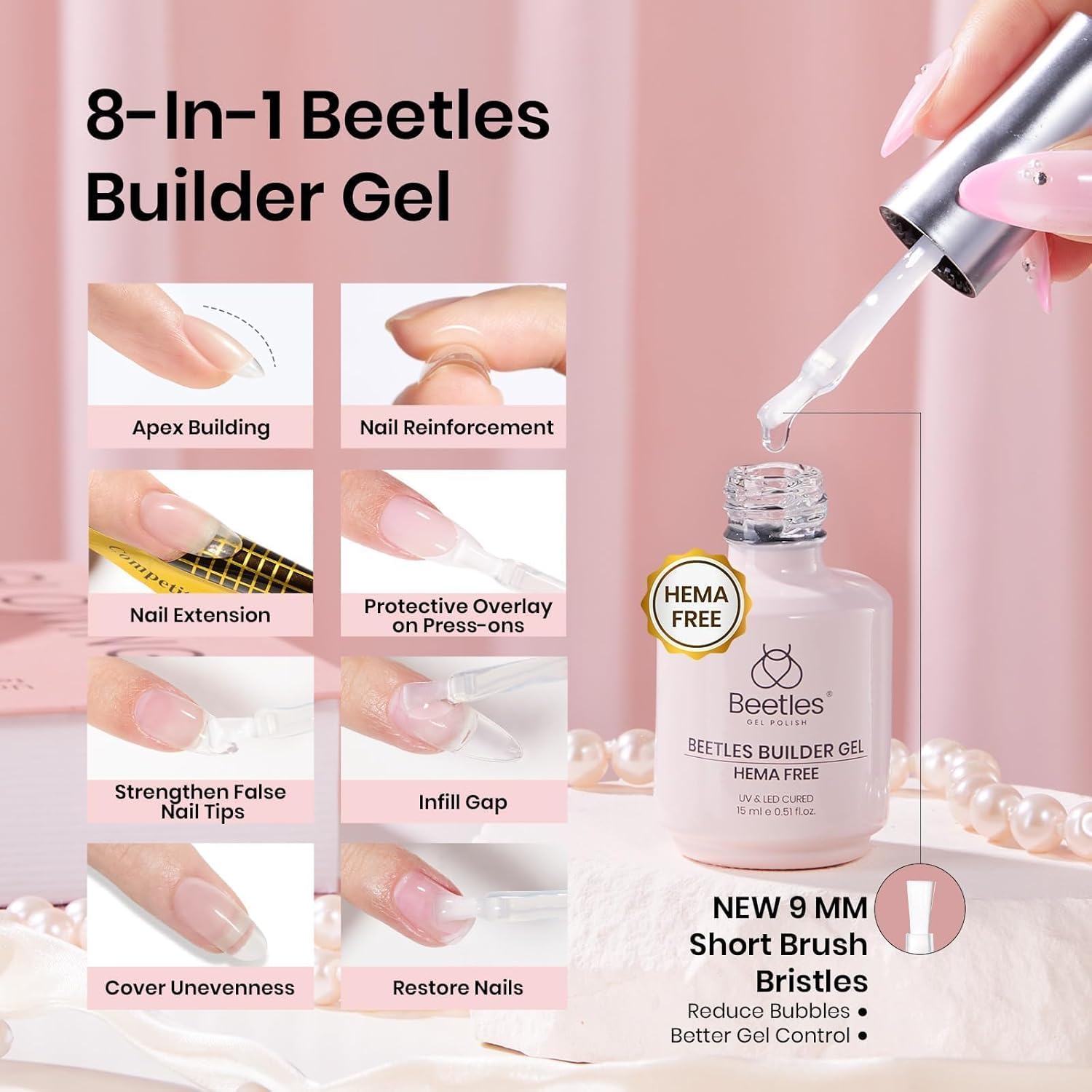 - Multi-Use Beetles Builder Gel with Liner Brush: The 8-in-1 HEMA-free beetles builder gel and liner brush combo helps shape the perfect apex, strengthen natural nails, repair cracks, fill gaps, and build extensions. Excellent self-leveling saves filing time.